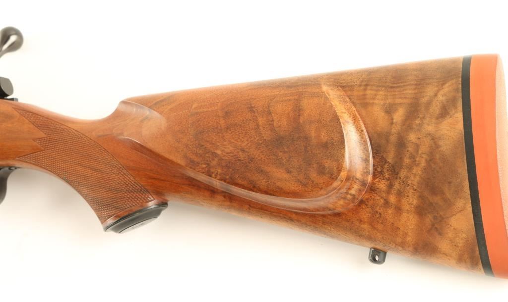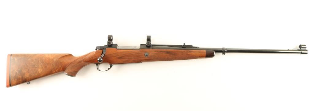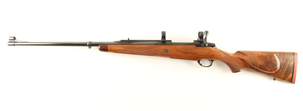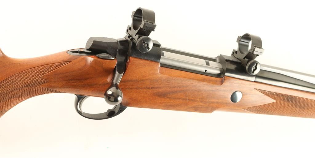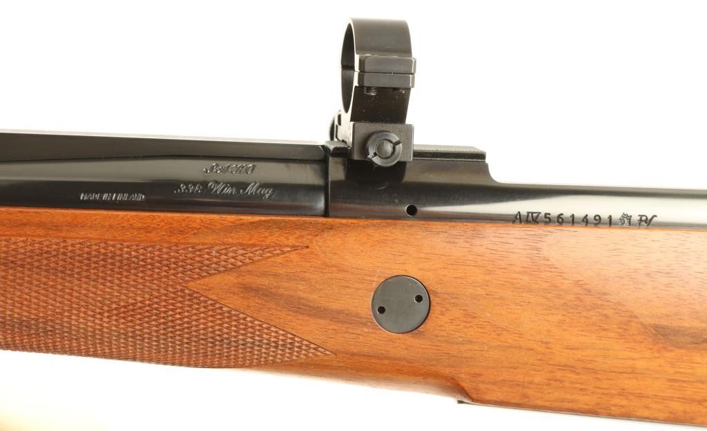 'AIV' Superb Finnish made bolt action hunting rifle chambered in .338 Winchester Magnum. Features a blued finish, 24 1/2" barrel, ramped & hooded blade front sight, adjustable window rear sight with additional folding leaf, integral scope rail with rings, internal magazine with hinged floorplate, swivel studs, cocked indicator, smooth trigger, sliding safety and checkered Monte Carlo style walnut stock with forend cap & Old English recoil pad. Rifle's finish is nearly impeccable showing little to no wear. Action is very smooth, bore is pristine and wood stock is extra fine. Condition is near mint. ***Modern Firearm***