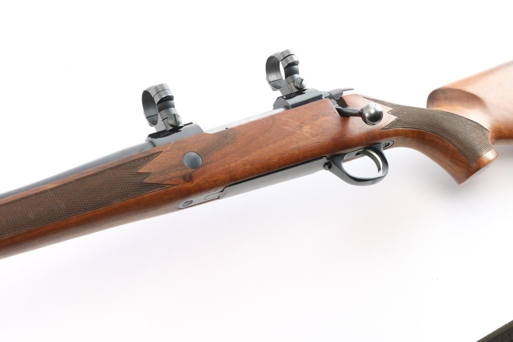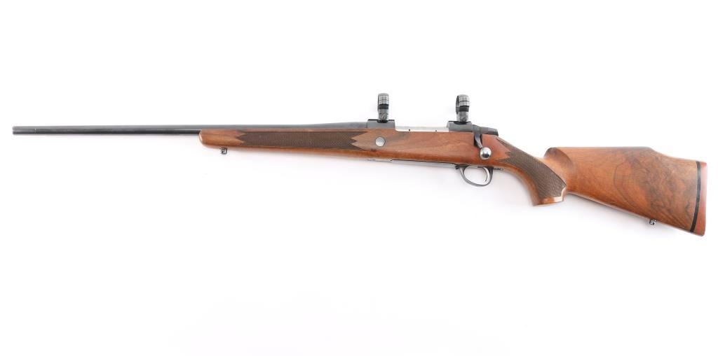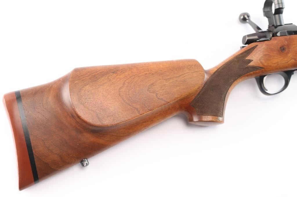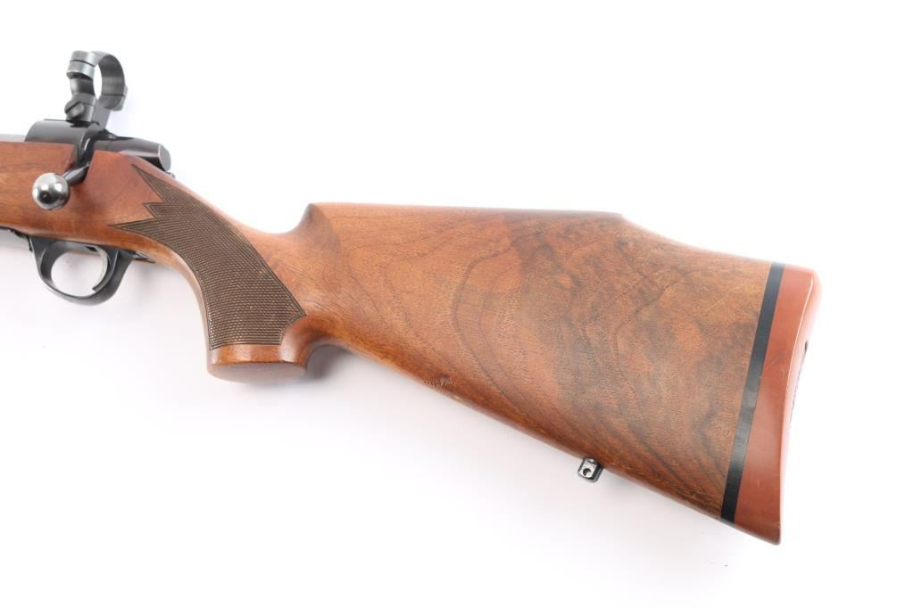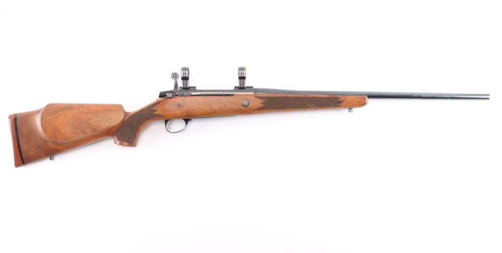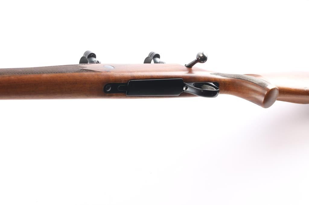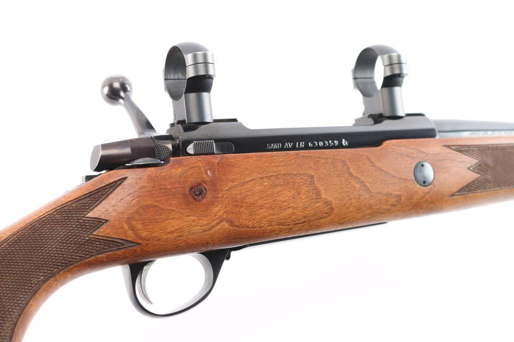 Left Handed Finnish bolt action rifle, imported by Stoeger, NJ. Features blued finish, wood Monte Carlo stock with left handed shadow line cheek piece, solid rubber recoil pad, checkered panels at forend & curved wrist, sling studs, 24" tapered barrel, no provisions for sights, hinged floorplate, manual safety, flat top receiver with dovetails. Two 1" scope rings installed . Bore is very good bright condition. Retains about 94% dark bluing with slight muzzle, minor scratches. Stock is very good with some minor scratches/dings.