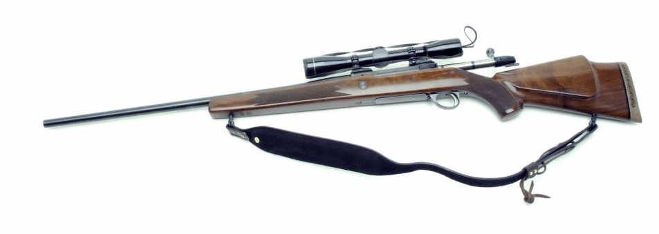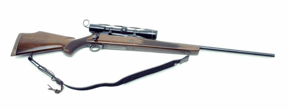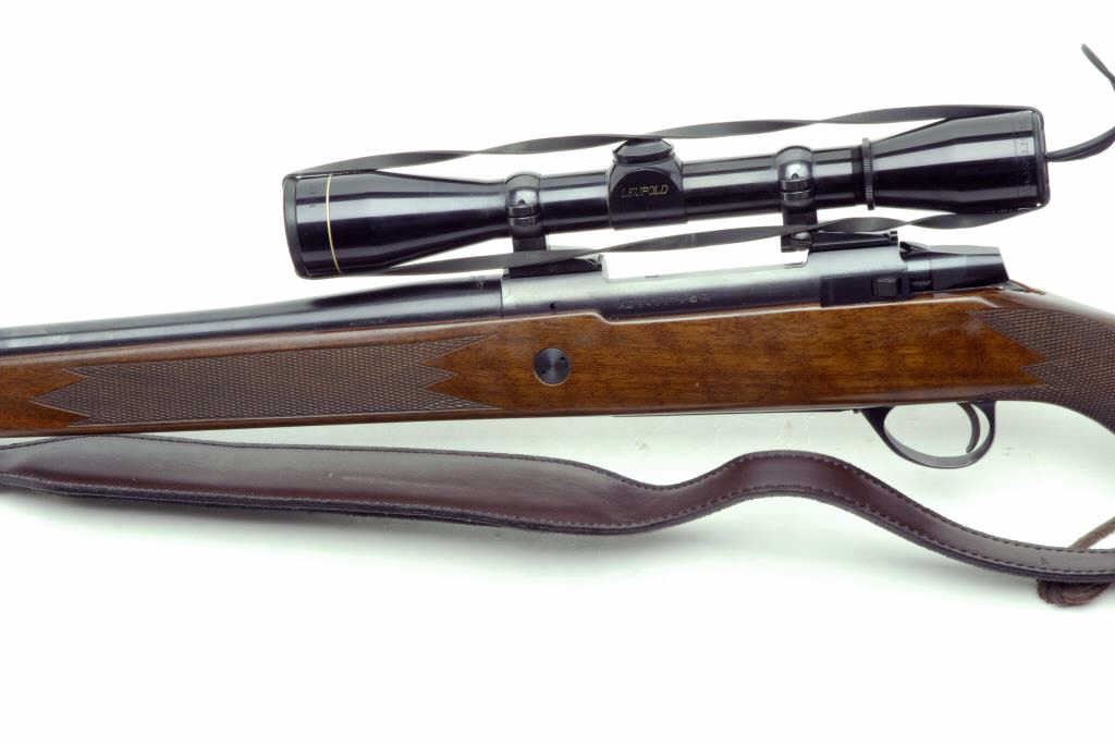 Sako bolt action rifle, .375 Mag. caliber, 25” round barrel, S/N 540678, blued finish, checkered wood stock with leather sling and mounted with a Leupold M8 6X scope displaying fine optics. This rifle is in overall minty condition showing little handling. (Modern/PPT). Est.: $600-$1,200.