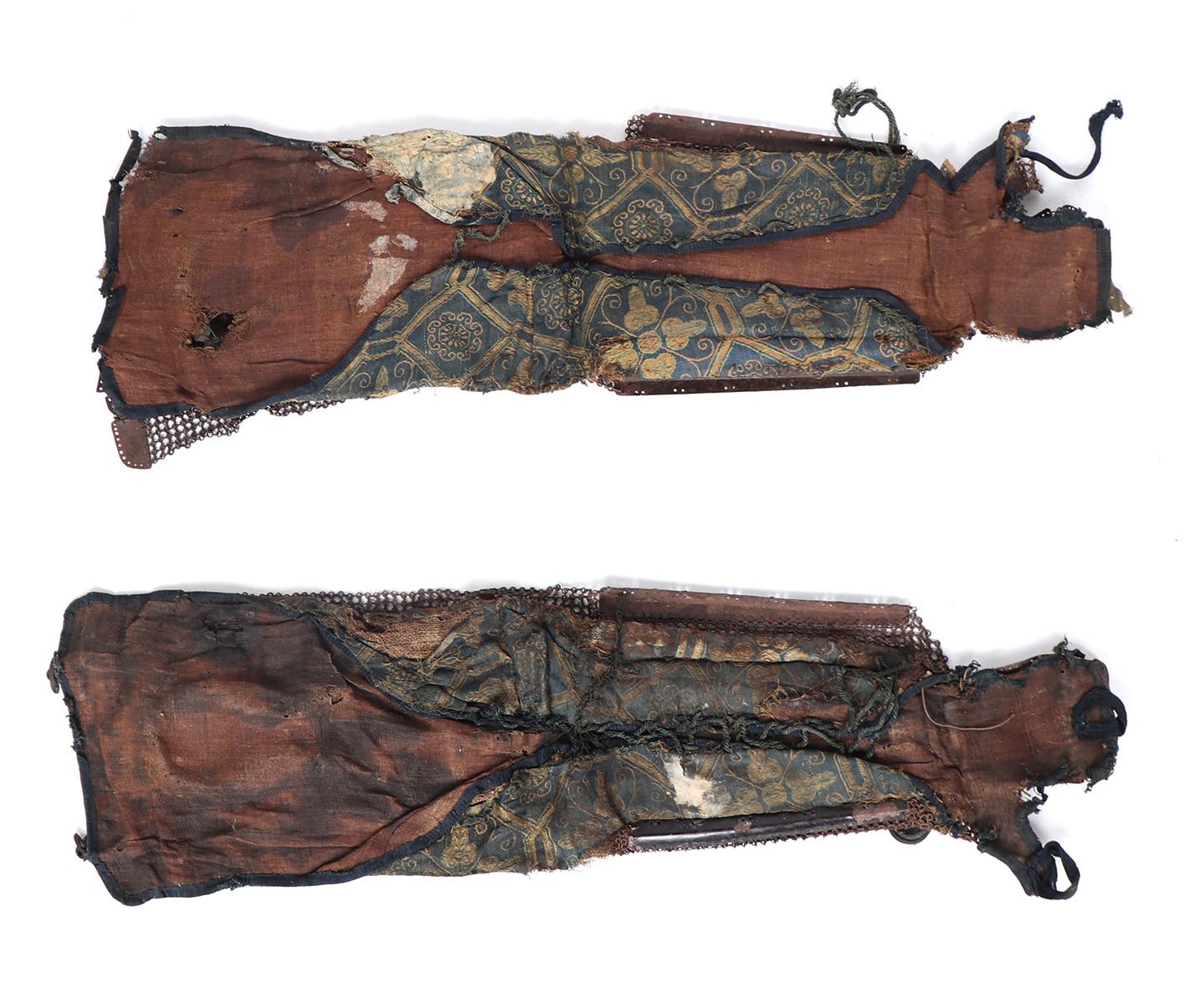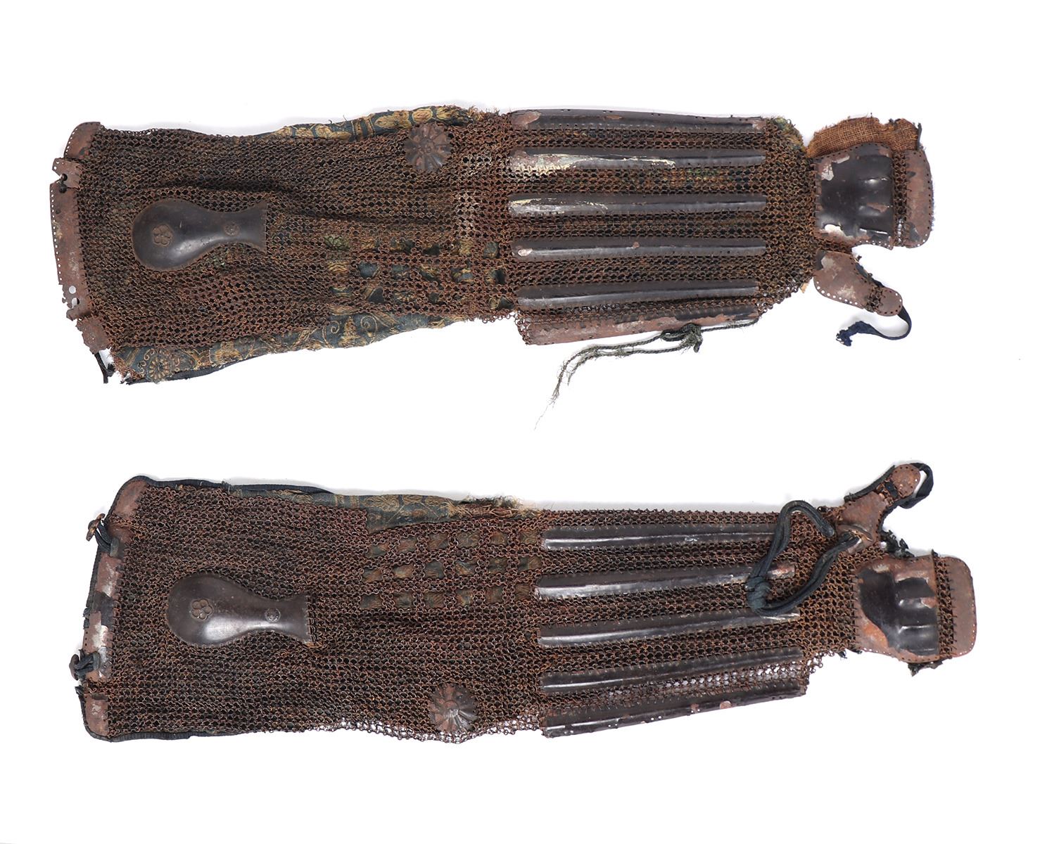 Japanese samurai armour "Kote" arm defense, Edo Period 1603-1868. Each arm defense with a series of 4 in 1 chain links connected to a series of lacquered iron lames backed with a blue linen, cotton, and gold silk backing. Size 26" L. Provenance: Ex-Southern California Collection