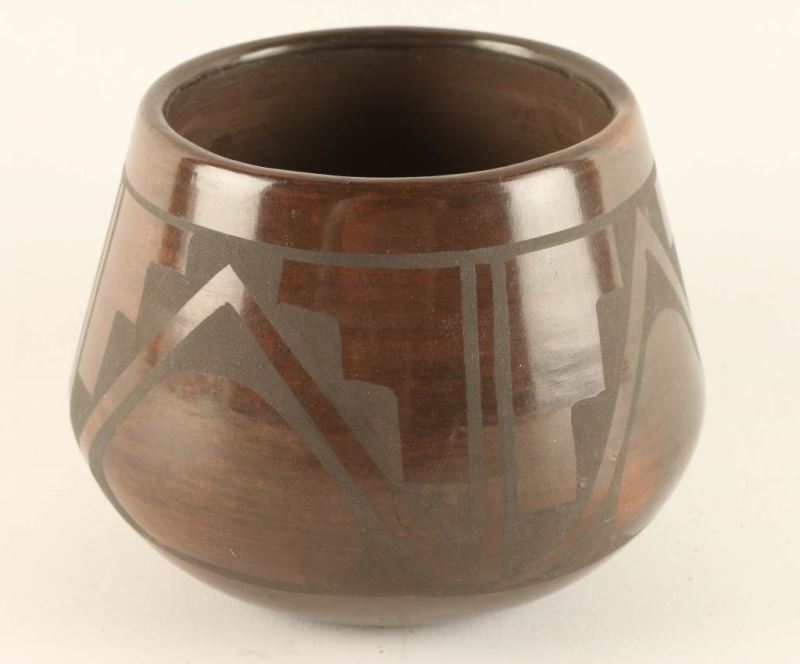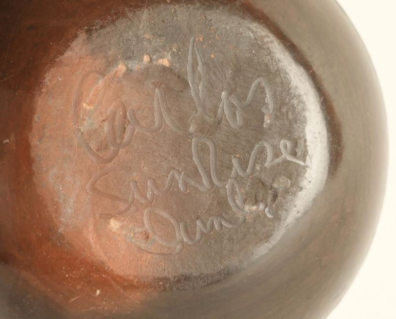 This San Ildefonso Pueblo Brown Pottery is a beautiful piece that was hand built, fired & stone polished by Carlos Dunlap.This unusual brown on brown piece was an innovative coloring that Carlos perfected. It's decorated with traditional patterns & is about 3-5/8" tall & 4-1/4" wide. Stand adds another 1" to height. Recently acquired at auction, it has some light scratching that can be seen on the high shine areas. Otherwise, it's in excellent condition. Signed. This San Ildefonso Pueblo Brown Pottery is a one of a kind & sadly, there will be no others made by this talented artisan. Carlos Sunrise Dunlap Jr. (1958-1981) career was tragically cut short by a car accident. He was on his way to becoming a major force in pottery innovations, such as the brown on brown that is offered here. His San Ildefonso mother, Carmelita & Apache father, Carlos Sr. were a wealth of knowledge to him & instrumental in his desire to follow in their footsteps.