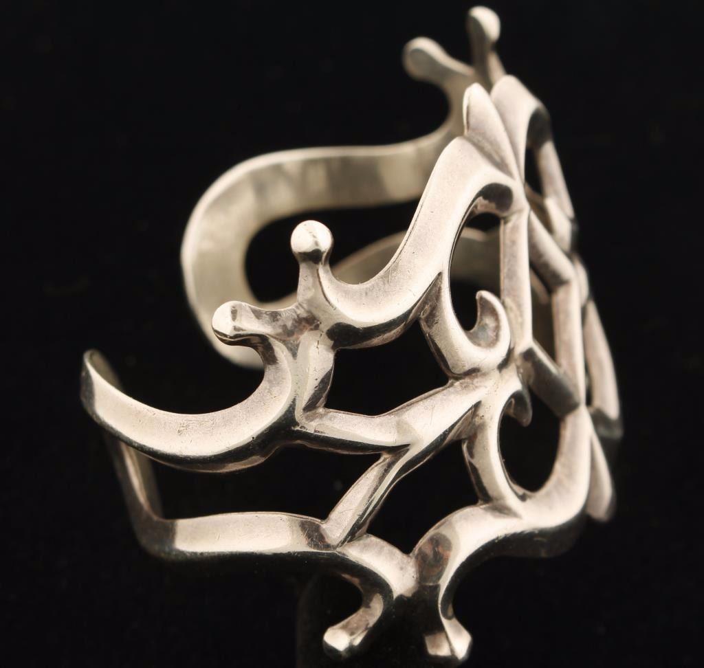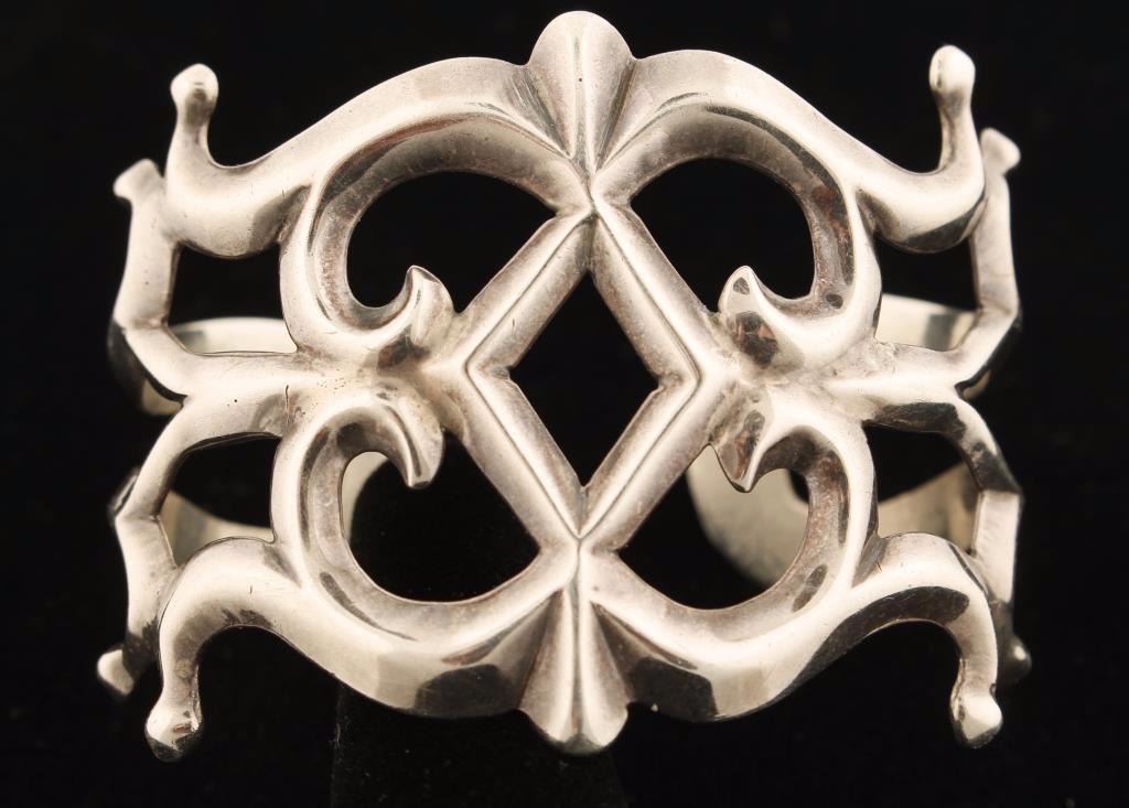 Elegant designed petite sterling silver Native American sand cast cuff. Unmarked, measuring 2.5" x 2" x 1.75". Condition is excellent.