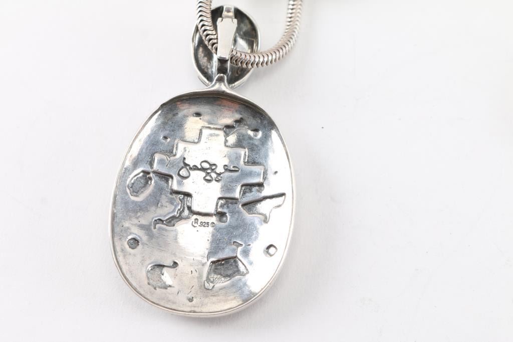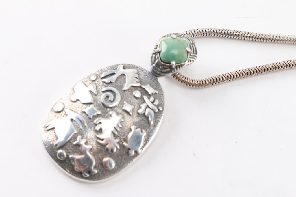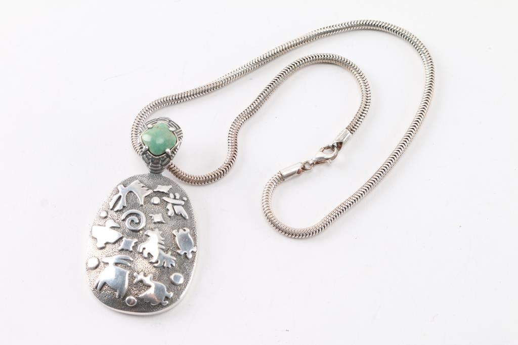 green turquoise tone with large animal effigy design in sterling silver handmade by Jody Naranjo an 8th generation Pueblo.On thick sterling chain
