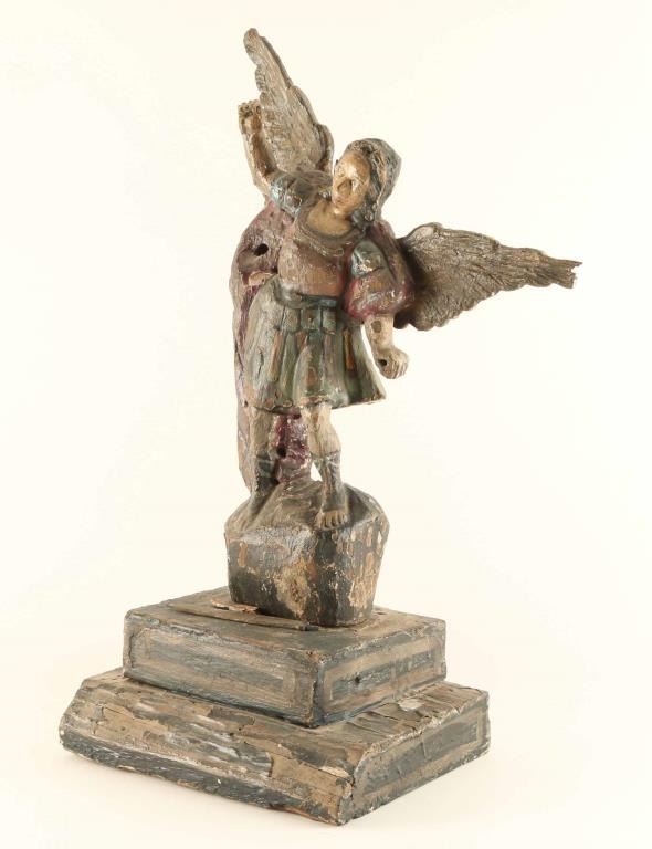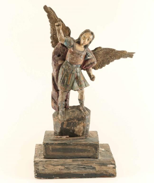 Circa the 17th century, this Santos depicts Saint Michael the Archangel. In as-found condition, shows age. 21 1/2" tall with an 8" x 10" base.