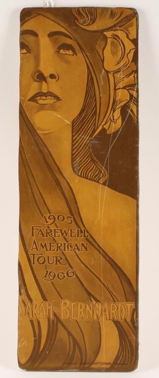 Reads "1905 Farewell American Tour 1906, Sarah-Bernhardt" mounted on board. Shows age and scratches. Measures 21"x7"