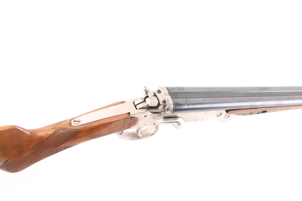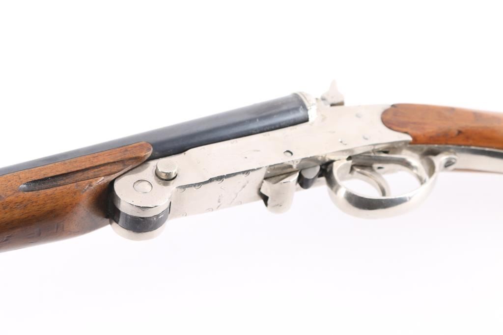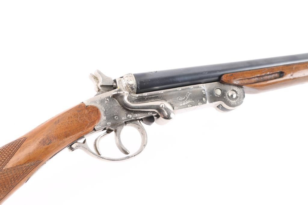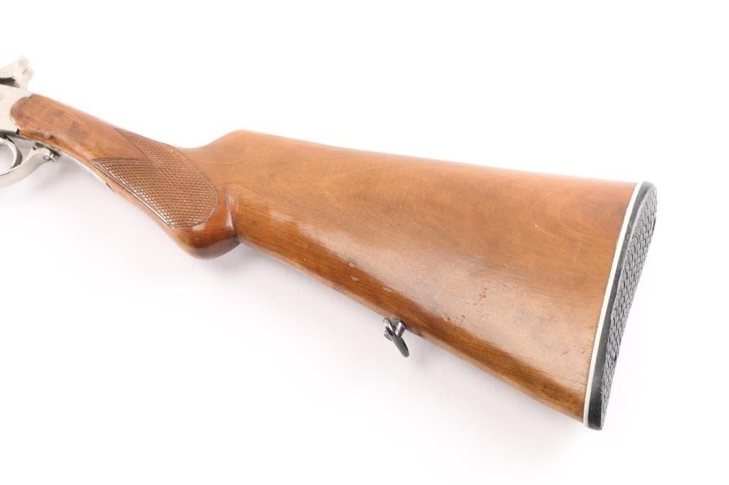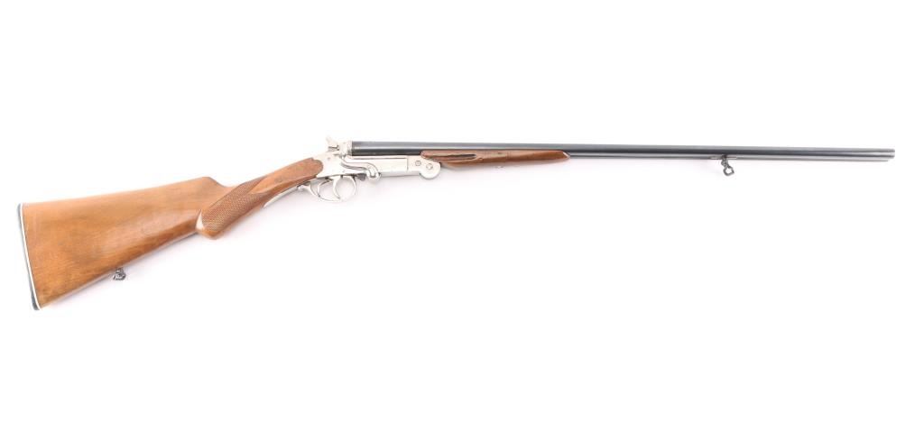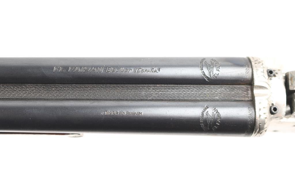 Elgoibar El Faisan SXS Double barrel shotgun in .410 GA. 3" chambers. El Faisan translated means "The Pheasant". Circa 1960-1980. 26" blued barrels, steel sighting bead, fixed Cyl chokes. It has dual hammers and triggers. The release lever is on the right side of barrel. There is scroll work with pheasant engravings on the chrome plated receiver. Bares are very good/bright, tight lock-up, wood is very good, hammer actions work well and the metal finishes are very good. Includes sling attachments.NRA condition-Very Good. Modern Firearm.