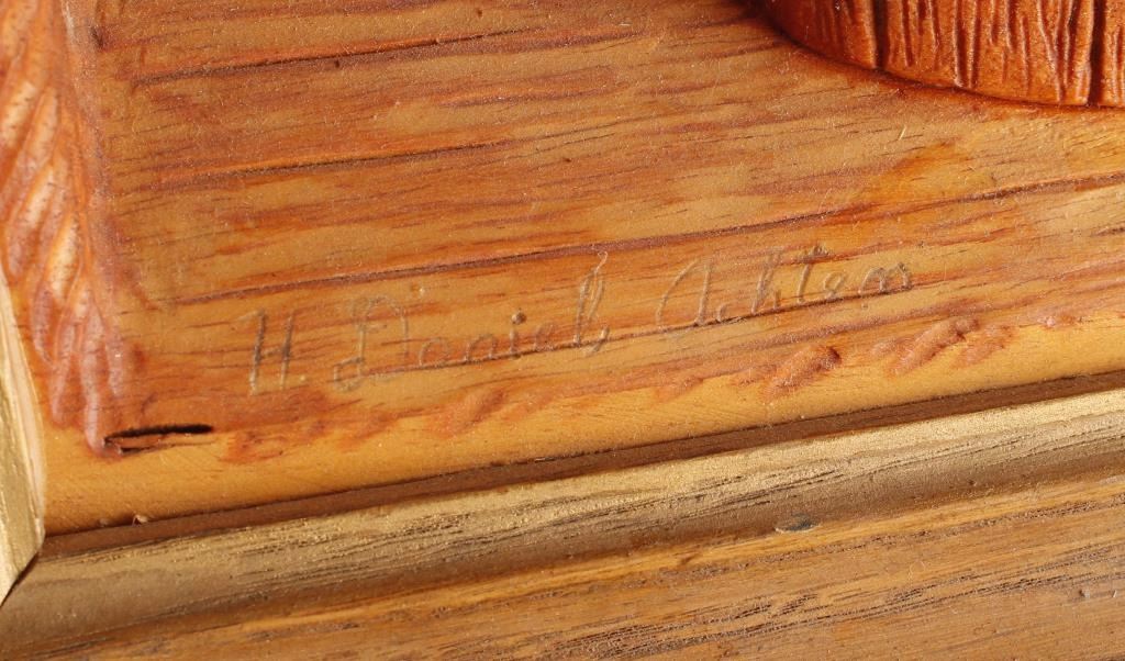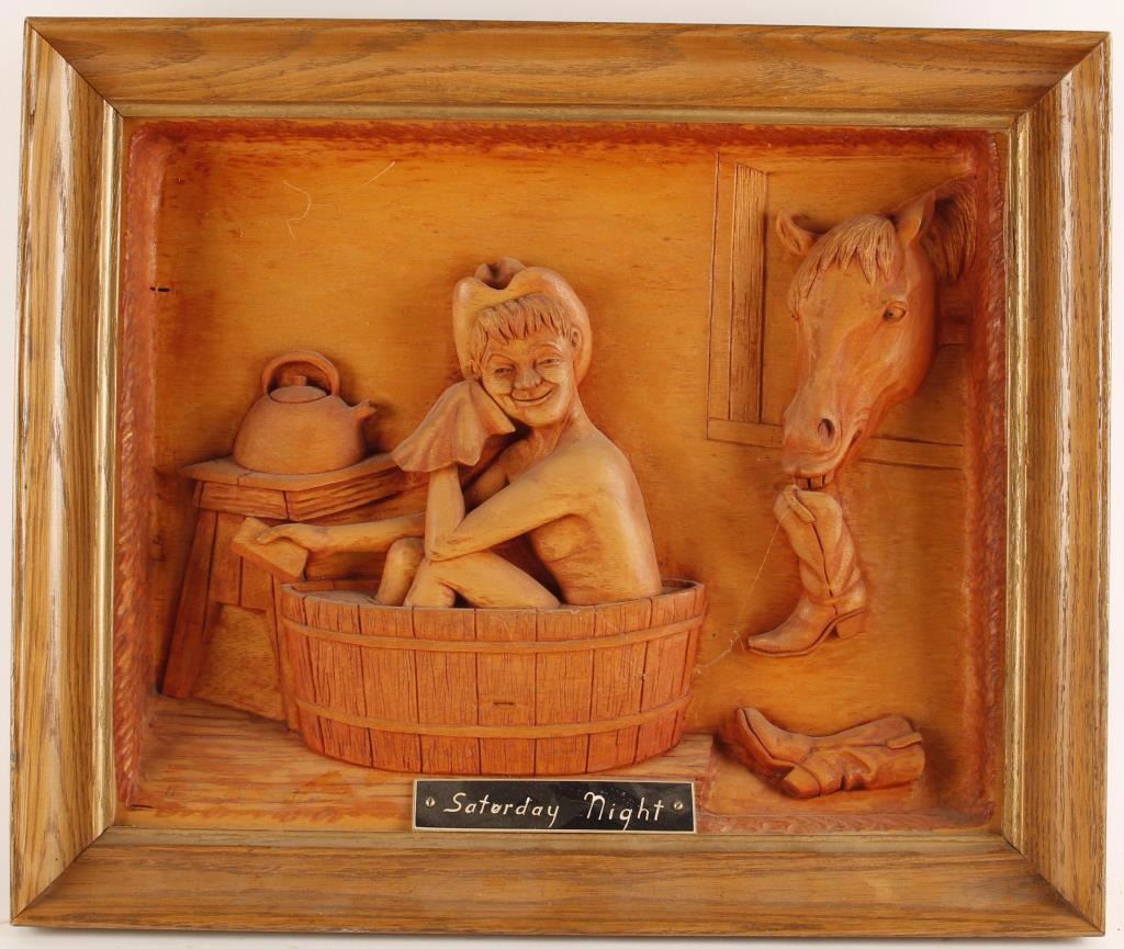Carved from a single piece of jelutong wood. A cowboy sits in a washtub as his horse steals one of his boots out the window. Signed 'H. Daniel Achtem'.