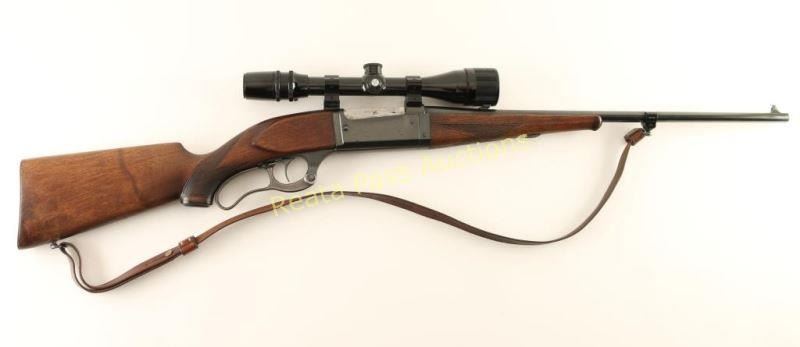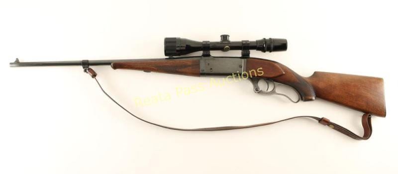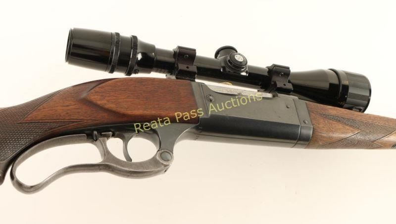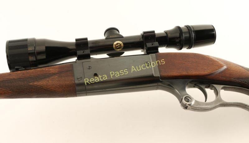Blued, lever-action, integral rotary magazine fed takedown rifle with a 22" barrel, folding adjustable rear sight, sling studs, leather sling, color case-hardened lever, cartridge counter, cocked indicator, 2-piece checkered wood stock set and a steel butt plate. Bluing on the barrel and receiver is almost immaculate with only a few scratches and a slight freckling of surface rust while the butt plate has edge wear and dings/scuffs on heel and toe. The case-colored lever has faded until there is almost no color remaining. Bore is bright and shiny with good rifling. Action works well. Wood has schnabel forend with a crack running back from the tip and minor scratches and dings on both pieces. Sling is 3/4" wide and nice and supple. Condition is good to very good. *Modern Firearm*
