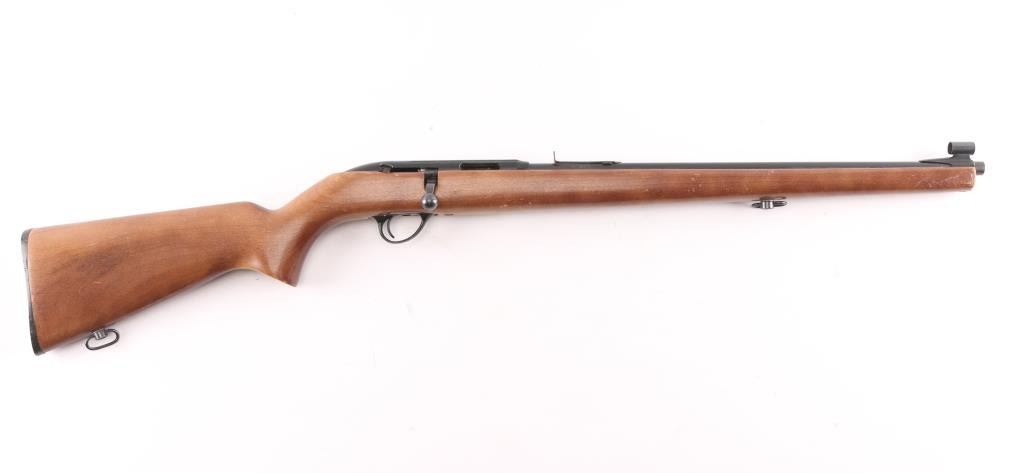 American made bolt-action rifle, manufactured 1963-69. 18" round barrel with ramped. hooded, front blade, and semi-buckhorn rear sights. Receiver slotted for scope mount. Right receiver mounted thumb safety. full length walnut Mannlicher stock with black plastic buttplate, and sling swivels. Bore is excellent/bright. Action is crisp/tight. Blued barrel, and matte black receiver are about 80% with some small scratches on receiver, and scattered surface rust/pin-prick pitting on the barrel. Wood is very good with minor scratches/dents.