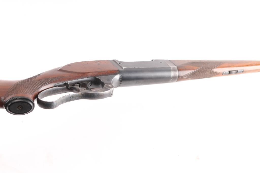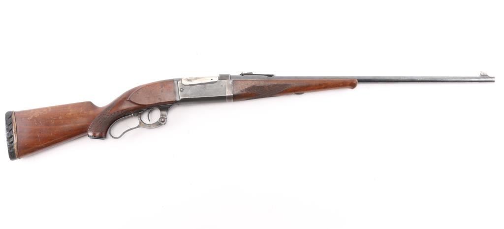 Lever action rifle manufactured circa 1927. Features blued finish, checkered walnut forend & curved wrist shoulder stock, Munson recoil pad, 24" tapered barrel, blade/bead front sight,adjustable rear sporting sight, fixed rotary magazine with brass cartridge counter, lever lock, cocking indicator, serrated trigger. Bore is very good and bright condition. Retains about 75% finish, with handling marks, edge losses & small scratches on receiver, some very minor scattered pin-prick pitting on the receiver. Bolt has bright surface. Case hardened colors on lever is mostly there. Wood is sound/good condition with some dents & scratches, some finish loss. Recoil pad has some chips.
