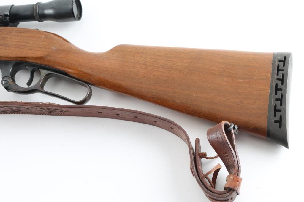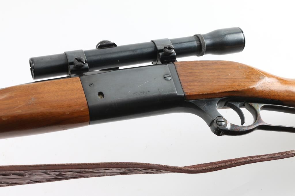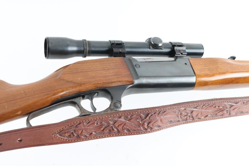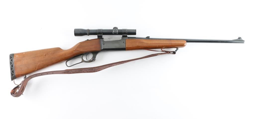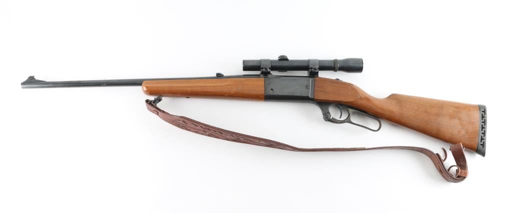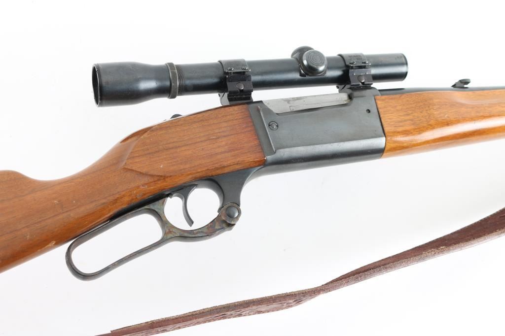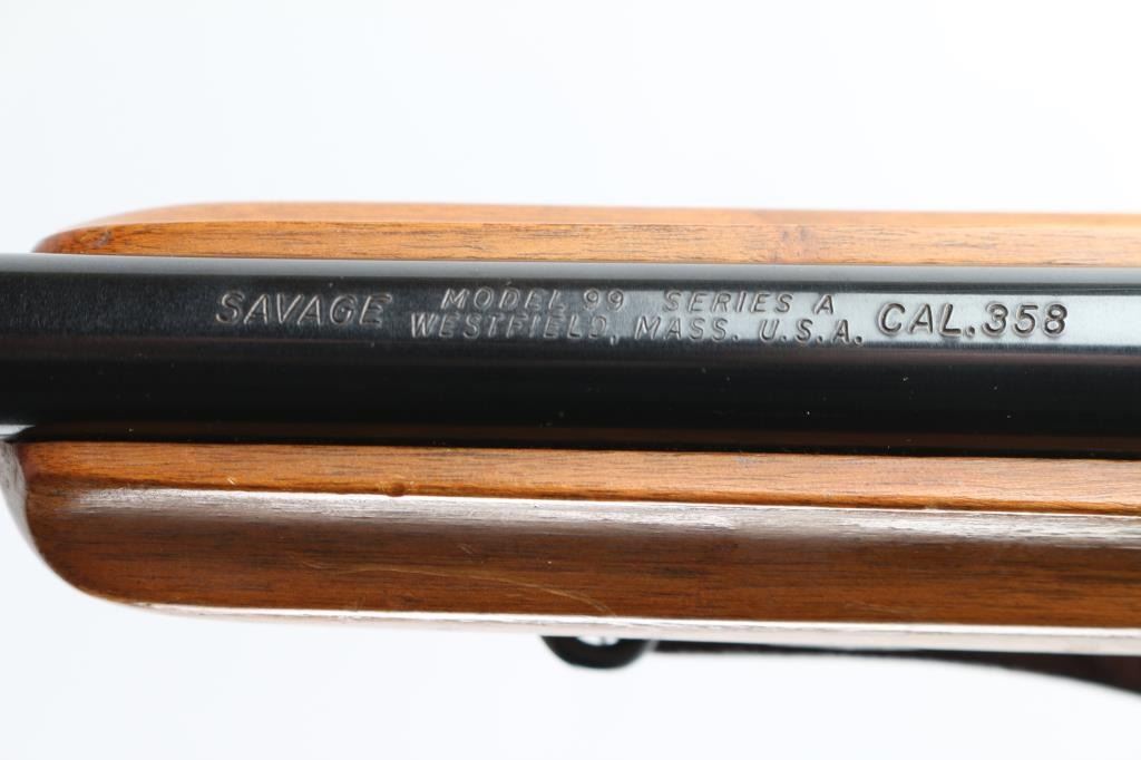Series A model 99 is a lever action rifle chambered for .358 caliber ammunition circa 1978. It has a 22" blued barrel and receiver, raised blade front sight, flip up rear sight, case colored lever looks good, serrated trigger and tang safety. Two piece wood stocks are plain with swivels and nice leather sling attached and a rubber recoil pad. Metal finish looks good with some signs of handling with a small rust spot on the barrel and a 1" scratch on the left side of the receiver. Wood stocks look good but used, no cracks, just scuffs. Bore looks pristine. LOP is 13.75". Comes with a Weaver K 2.5 fixed power scope with rings. Condition is NRA Very Good *Modern Firearm*