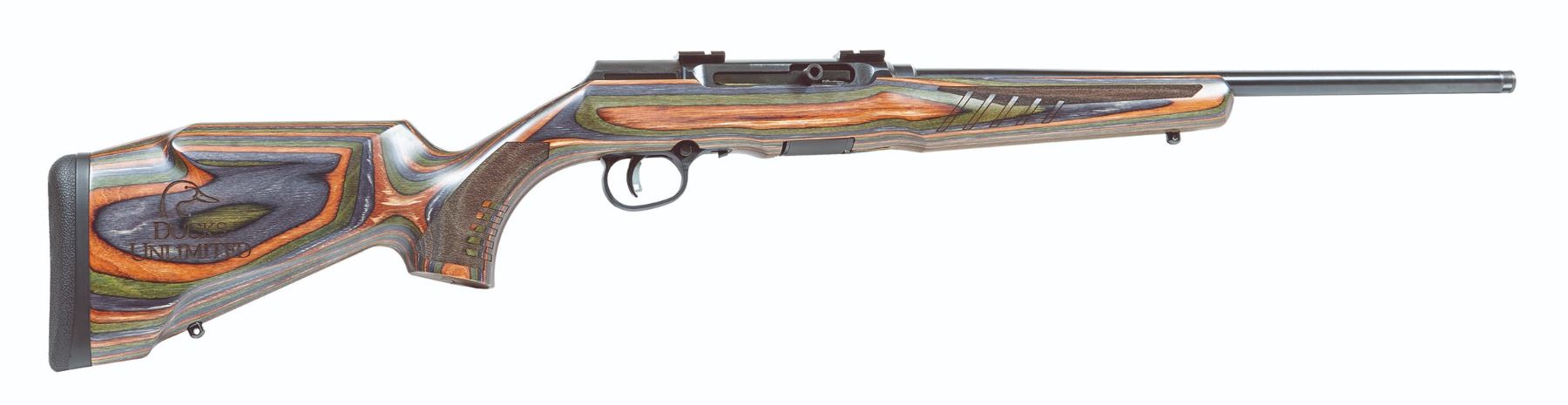 .22 caliber semi-automatic rifle. Accu-trigger adjustable trigger system. Black barrel and action. Timber hardwood multi-color laminate stock. Ten round magazine. DU logo on the stock. Gun lock included.