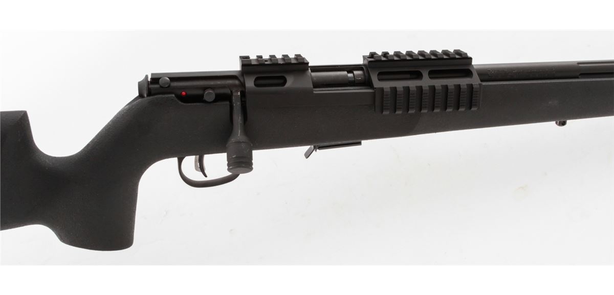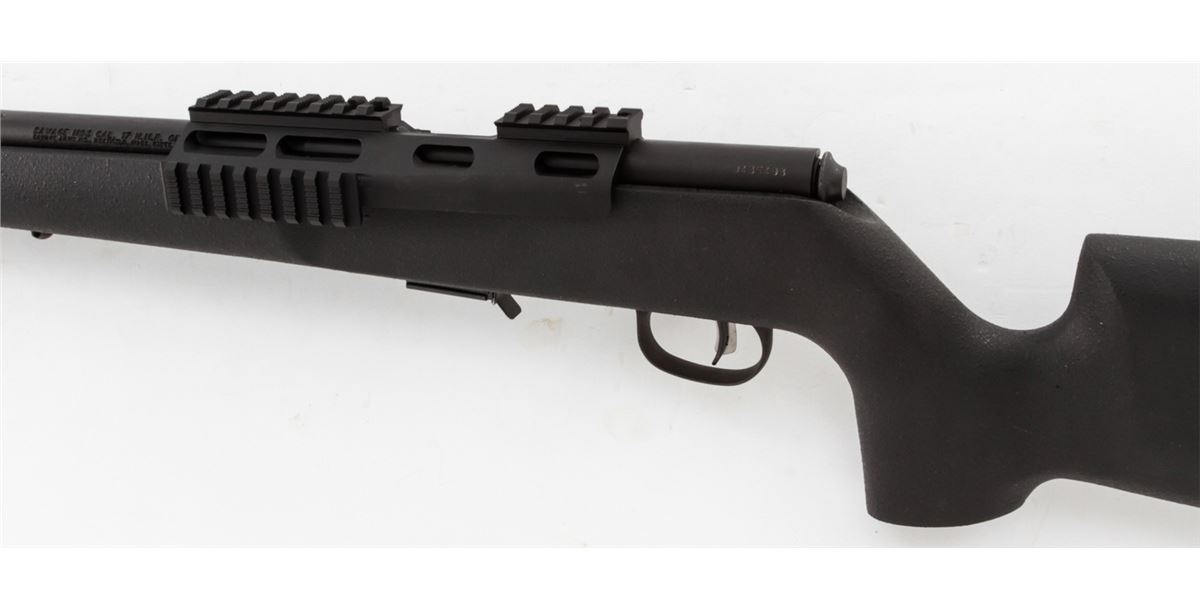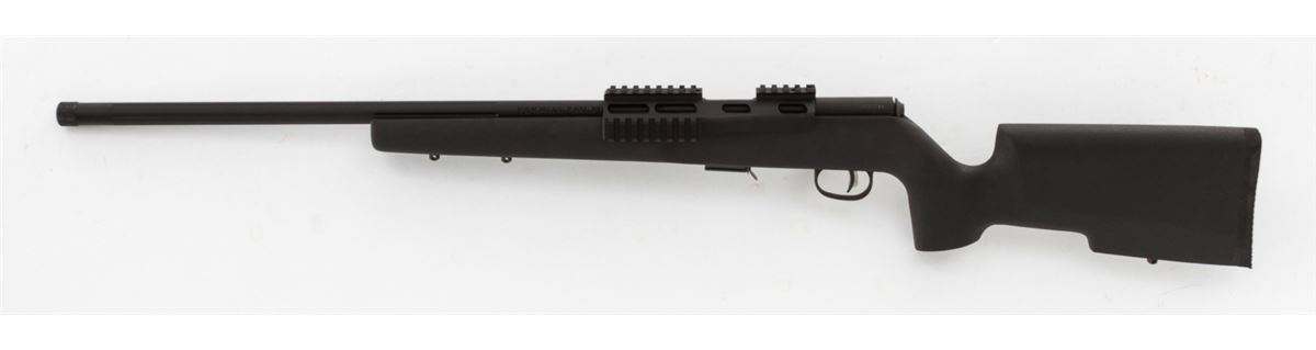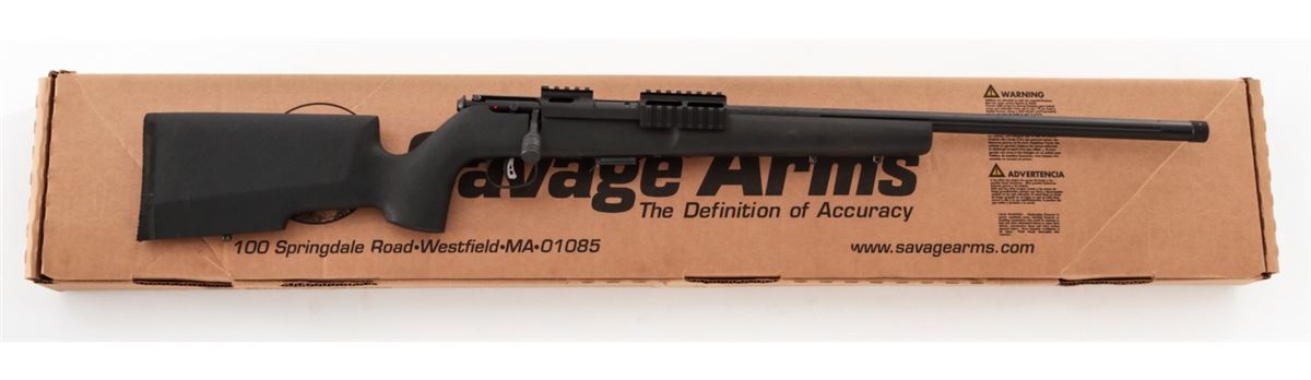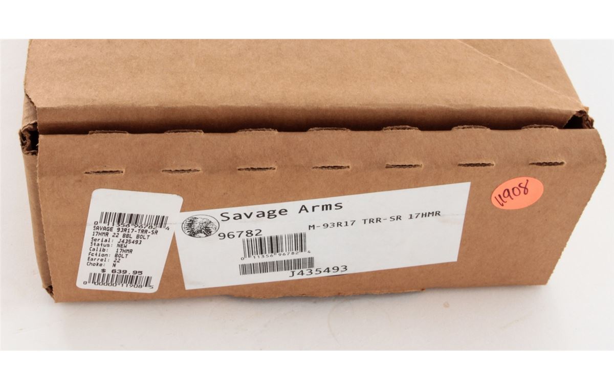 Savage Arms Model M-93R17 TRR-SR Bolt Action Rifle, #J435493, .17 HMR cal., 22'' fluted and threaded barrel, matte black finish, textured synthetic black stock, top Picatinny rail, Accutrigger, and one (1) magazine and gun lock, in box with matching end label and owner's manual. Condition is excellent, remaining new and unfired. Bolt and rail with light marks from handling. With original hang tag still intact. Retails @ $639.95. Est.: $350-$500. (Modern) (Field Time)