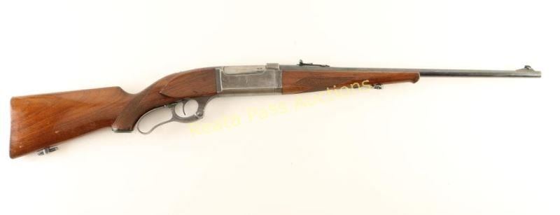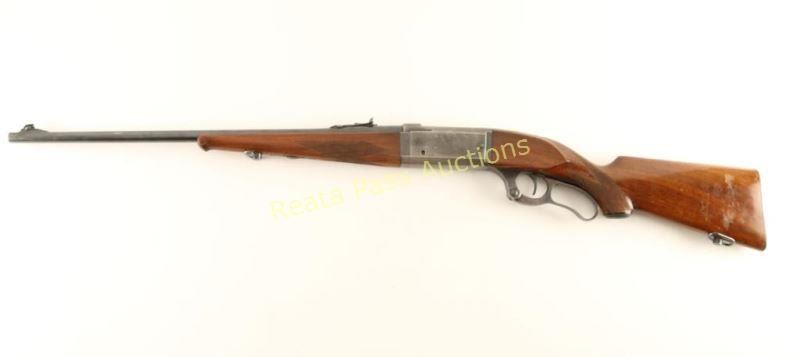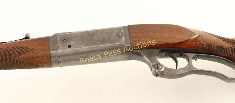 Blued. lever-action, integral rotary magazine fed takedown rifle with a 22" barrel, sling swivels, ramp adjustable rear sight, drilled and tapped for scope, cartridge counter, cocked indicator, case-colored lever, 2-piece checkered wood stock set and a steel butt plate. Bluing has edge and general wear with a few minor scratches. Lever still retains much of the bright case coloring. The butt plate is worn to bare metal with some pin-prick pitting and scuffs. Bore is bright and shiny with strong rifling. Action works well. Wood forend has some worn edges on the schnabel tip with finish worn to bare wood in spots. The butt has worn finish, dings, rubs and scratches. Condition is fair to good. *Modern Firearm*