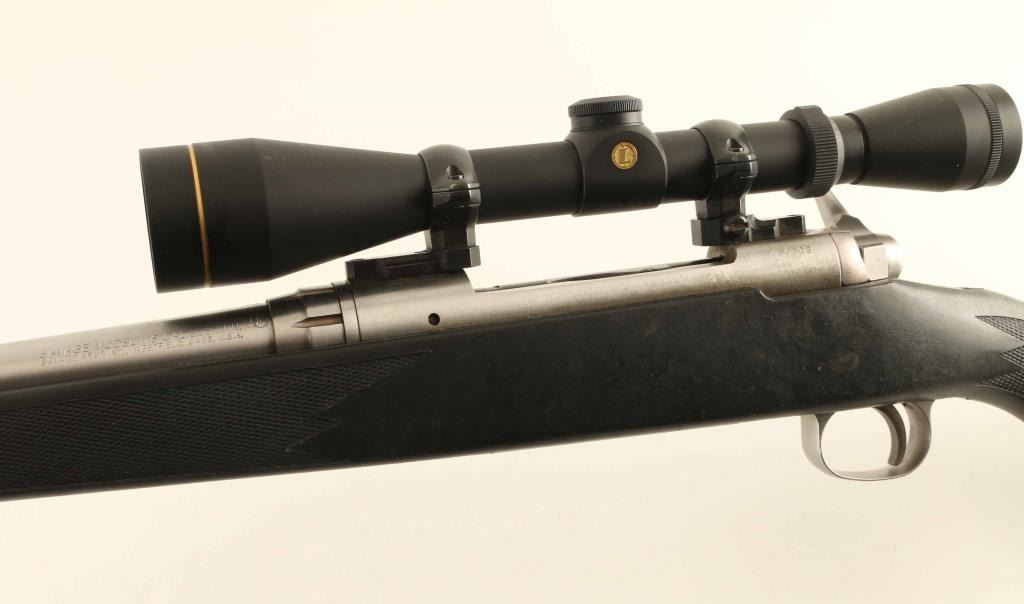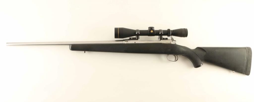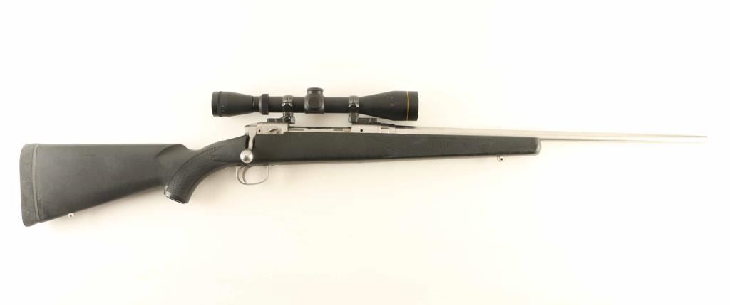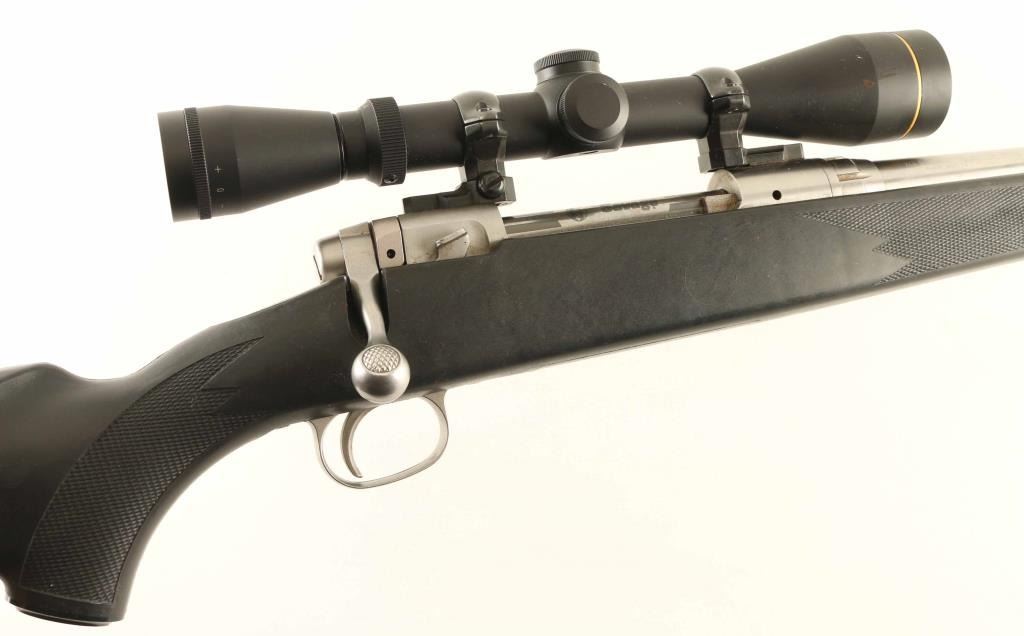 Bolt action rifle features stainless steel construction, black polymer stock with checkered panels at forend & curved wrist, no cheekpiece, solid rubber recoil pad, sling studs, 22" barrel, no sights, Leupold type bases & rings, blind magazine, manual safety. Bore is excellent condition. Stainless steel surfaces are excellent condition. Stock is very good condition with scratches and scrapes, especially at grip. Recoil pad has gouged appearance around edges. Mounts a very good condition Leupold VX-2 4-12x40mm scope with duplex reticle & clear view. Condition is NRA Very Good ++ *** Modern Firearm ***