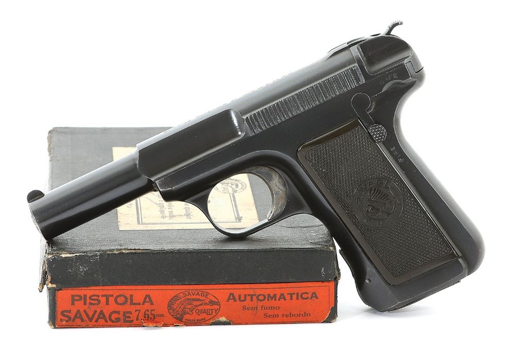 serial #229313, 32 ACP, 3 3/4'' barrel with a fair bore showing some moderate oxidation, old pitting and evident rifling throughout. The metal surfaces of this later production 1907 retain about 95% original dull blue showing some mild high edge wear and fading under bright light, a few oxidation speckles, and a small area of light pitting at the heel. The trigger shows good case-hardened colors throughout, all markings are strong and the black checkered hard rubber grips remain in near excellent condition. One original magazine is included and the action seems to function well mechanically. The black paper-covered box remains in very good plus condition with a tear along one lid corner and light scuffing. The Portuguese lid label and red end label are intact with a little mild flaking and there are some scattered areas of hand-written scribbling which also appears to be Portuguese. The box appears to be un-numbered and the interior lid label is also intact in fine condition. Portugal was one of the larger foreign purchasers of the Savage Model 1907 pistol. (13A11264-72) {C&R} (700/900)