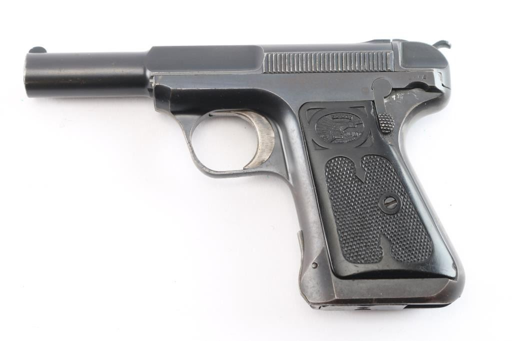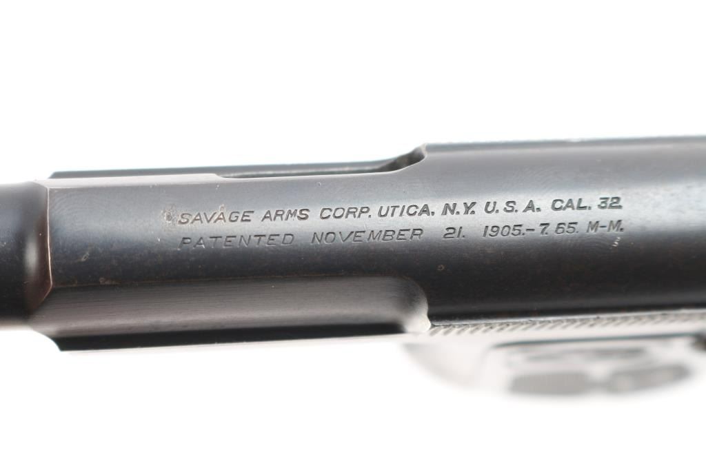 Savage 'Model 1917' Vintage American made striker fired semi-automatic compact pistol manufactured circa 1920-1926. It features a blued finish, 4" barrel, inverted 'V' front sight, fixed notched rear sight, smooth curved trigger, serrated cocking lever, manual safety/slide catch on the left side of the frame, toe magazine release, 10 round magazine, steel frame and two-piece fancy checkered black synthetic grips with Savage insignias. Bore is dirty with strong rifling. Blue finish is about 75% with muzzle/edge wear, some handling loss on the backstrap, and some loss on the front of the trigger guard. Synthetic grips are overall very good with a small chip on the right panel, and two minor chips on the left panel. Includes (1) original magazine showing some rust.
