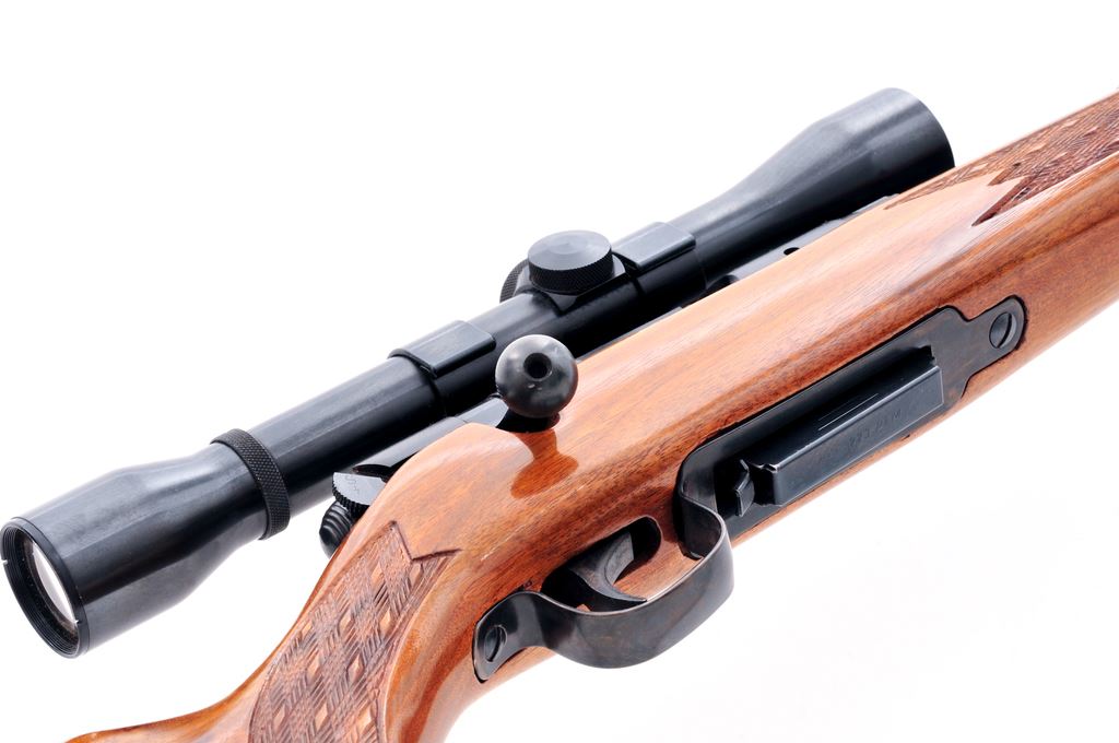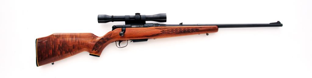 Savage Model 340 Series E Bolt Action Rifle, #C569475, .223 cal., 24'' barrel, blue finish, pistol-grip walnut stock with skipline checkering, black plastic buttplate and grip cap, sling swivel studs, fixed front sight, folding ''U''-notched rear sight, and one magazine. Topped with a Sears Ted Williams 4xW scope on a Weaver 1'' side mount; scope with a duplex reticle. Approx. 95% blue finish remains and metal surfaces rate as fine overall, with the majority of the finish loss occurring on the triggerguard which has been cleaned. Stock with a smooth gloss finish showing minimal handling marks and is excellent overall. Action and bore are both excellent. The objective bell with a few moderate dings and the objective lens has been adhered into place; optics are surprisingly clear and the field of vision is not affected. Est.: $150-$300. (Modern)