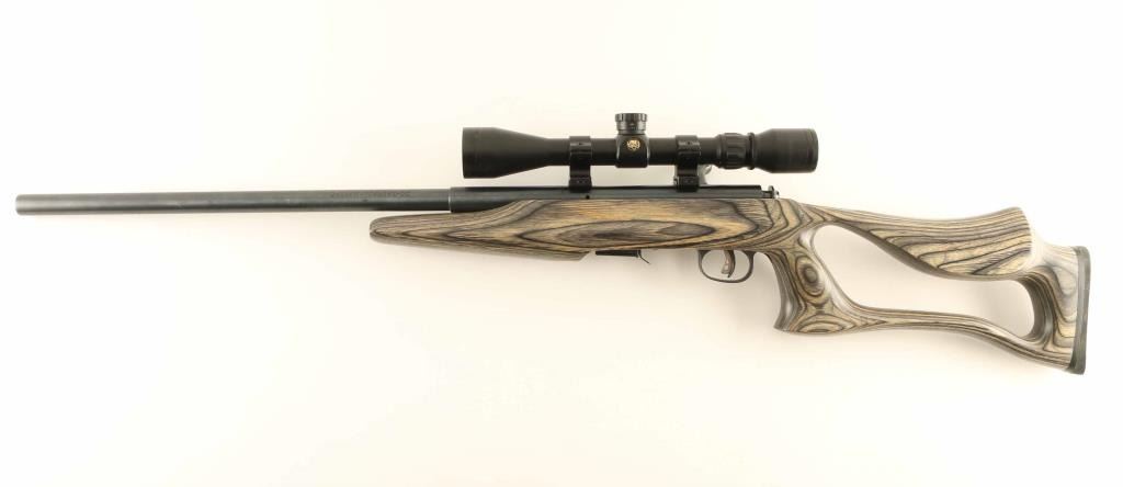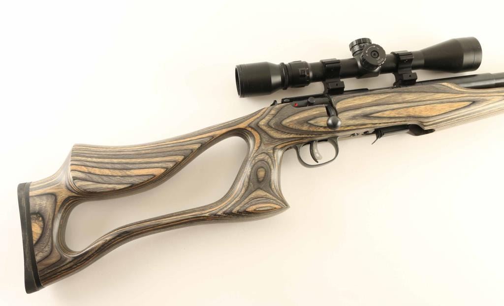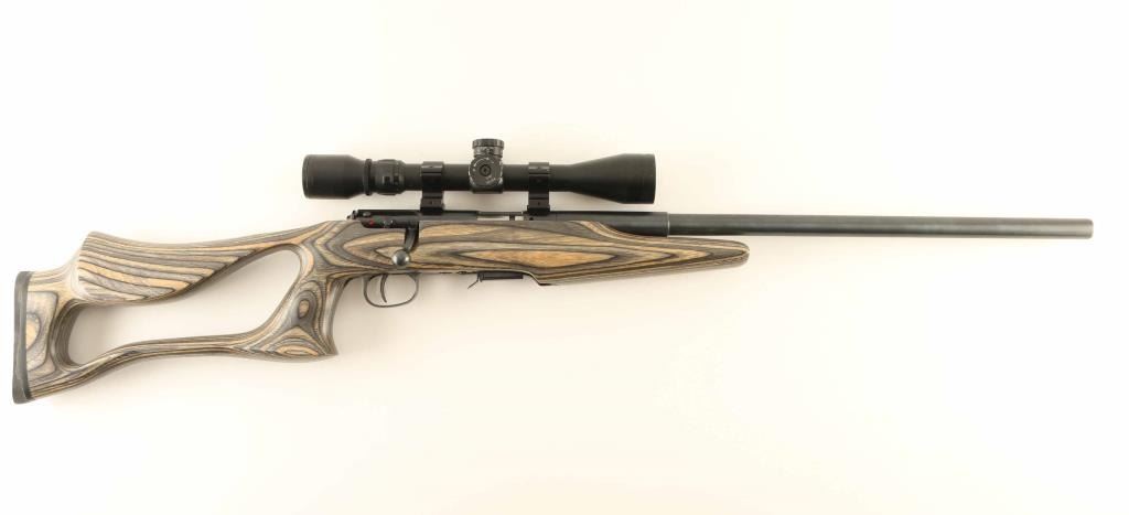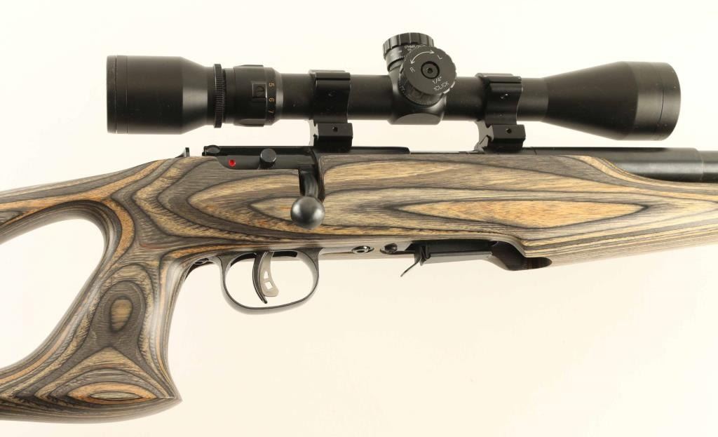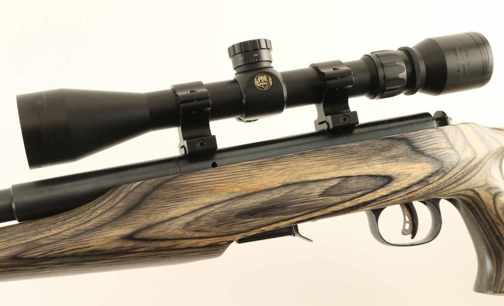 Bolt action rimfire rifle feature blued finish, green & brown laminated thumbhole stock, solid rubber recoil pad, 21" barrel, no sights, dovetailed receiver for scope mounting, Savage AccuTrigger, detachable magazine, manual safety. Bore is excellent. Overall like new condition. Mounts a Pine Ridge 3-9x scope, duplex reticle, clear view. Condition is NRA Excellent - like new *** Modern Firearm ***