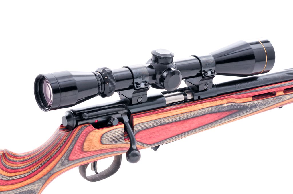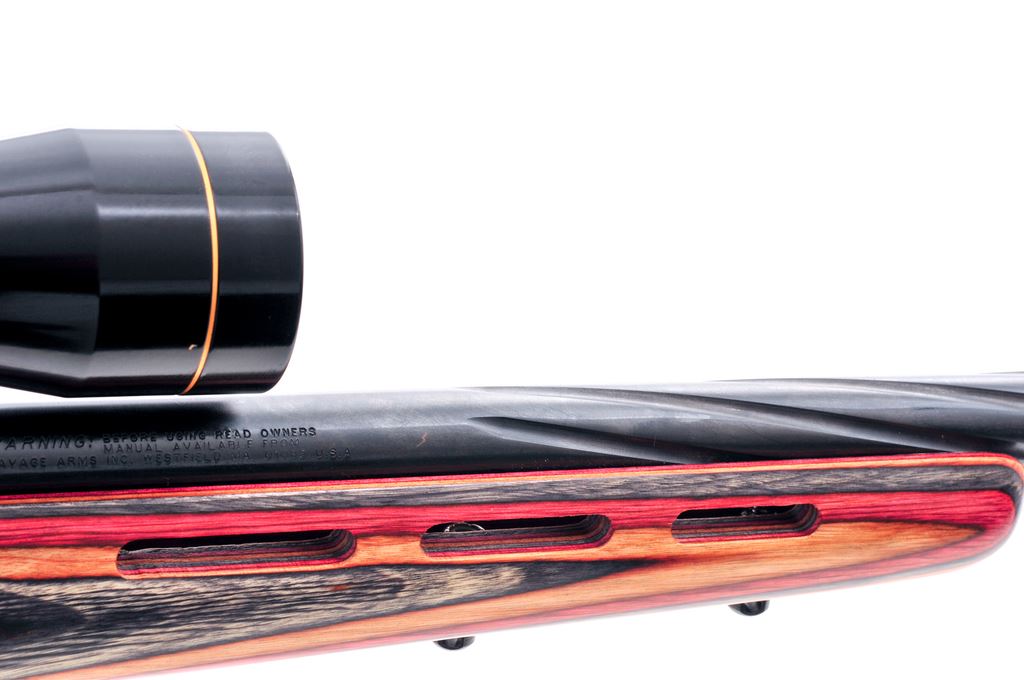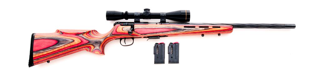 Savage Model 93R17 BRJ Bolt Action Rifle, #1702173, .17 HMR cal., 21'' spiral fluted barrel, dark blue finish, multi-colored laminate Monte Carlo stock with pistol grip, vented forend, black rubber recoil pad, and three (3) sling swivels. Rifle also features an AccuTrigger, and includes one 5-round and two (2) 10-round magazines. Topped with a Leupold VX-I 3-9x40mm scope with soft rubber Leupold lens covers; scope with a duplex reticle. Condition is excellent with nearly all of the original blue finish, the barrel with a few slight handling marks. Stock appears near new with a couple of minor impressions to the right side of the buttstock and at the forend. Action and bore are both excellent. Scope exterior shows only light wear; optics are bright and clear. Est.: $350-$550. (Modern)