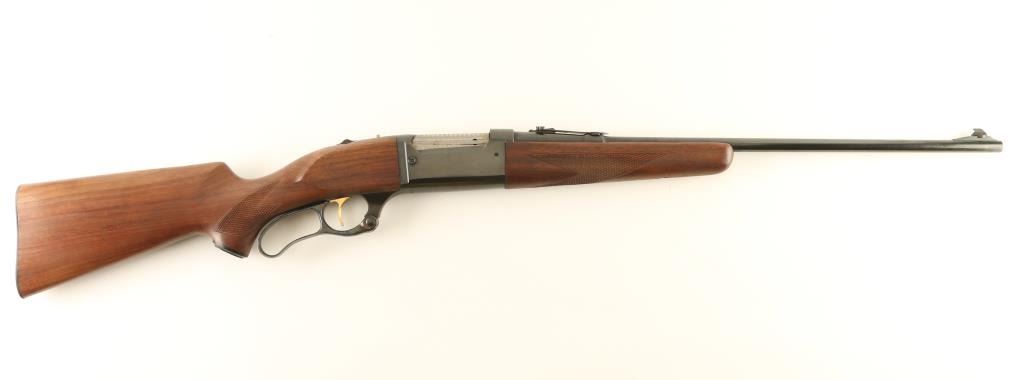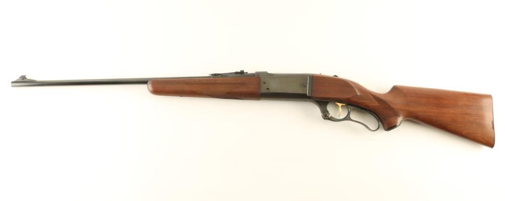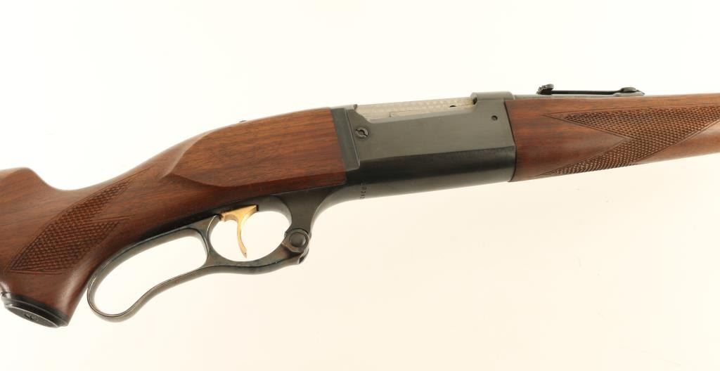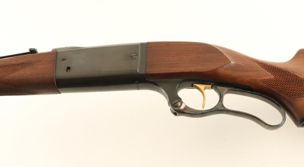 Lever action rifle features blued finish, case color finger lever, gold color accent trigger, two piece wood stock with curved grip, checkered panels at wrist & forend, flat steel buttplate, 22" barrel, buckhorn style sights with folding rear sight, fixed rotary magazine with brass cartridge counter, tang safety (also locks lever), cocking indicator. Bore is very good condition. Retains 85% blue, scratches on barrel & receiver, bare metal on sharp edges. Finger lever retains bright case color. Wood is very good with dents & scratches. Condition is NRA Very Good + *** Modern Firearm ***