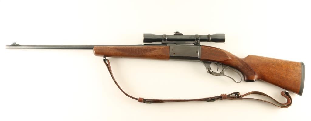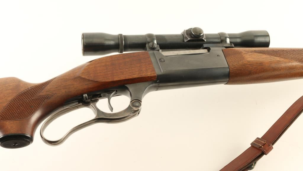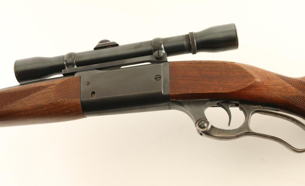 Lever action rifle features blued finish, case color finger lever, two piece wood stock with curved grip, checkering at wrist & forend, solid rubber butt pad, 24" barrel, blade front sight, empty dovetail mid-barrel where rear sight was removed, one piece Buehler scope mount & rings, fixed rotary magazine with cartridge counter, lever lock safety, cocking indicator, sling swivels. Bore is very good condition. Retains 80% blue,with scratches & scuffs, bare metal on sharp edges, small areas of patina on receiver. Finger lever retains some fading case color. Wood is very good with dents & scratches, deeper creases on sides at butt. Butt pad is good condition with small piece torn from edge of heel. Mounts a good condition unmarked vintage scope, appears similar to Weaver, about 4x, with post style reticle & good optical view. Includes good condition leather sling. Condition is NRA Very Good + *** Modern Firearm ***