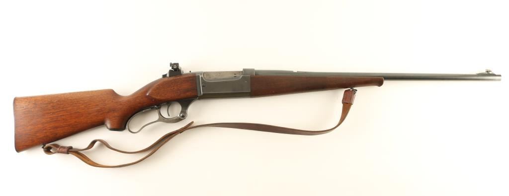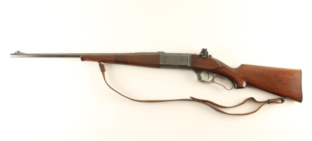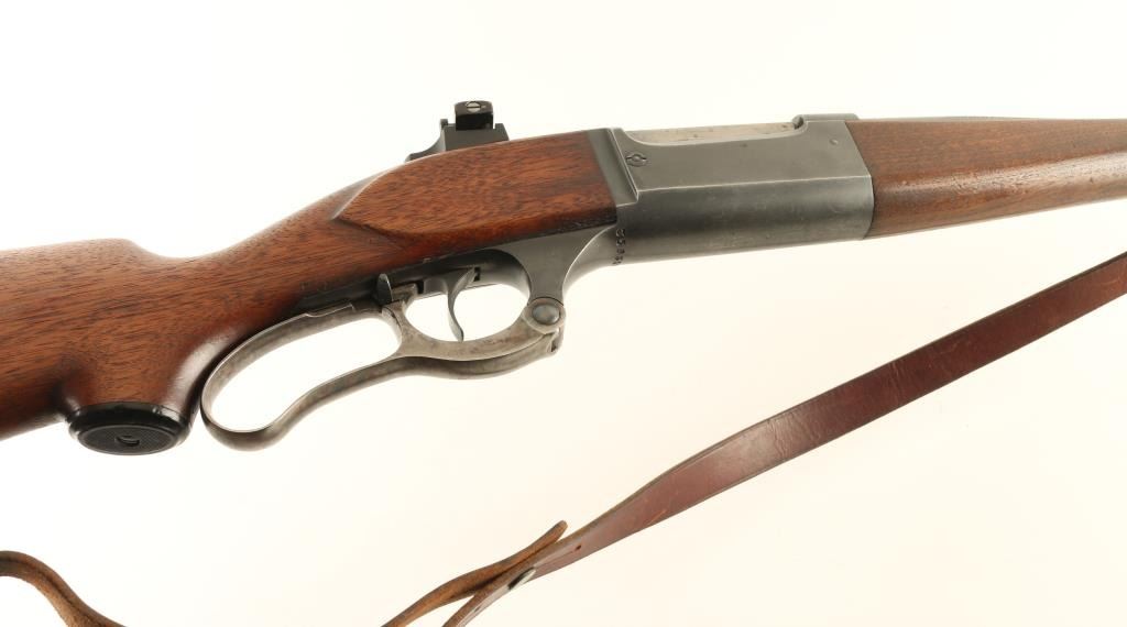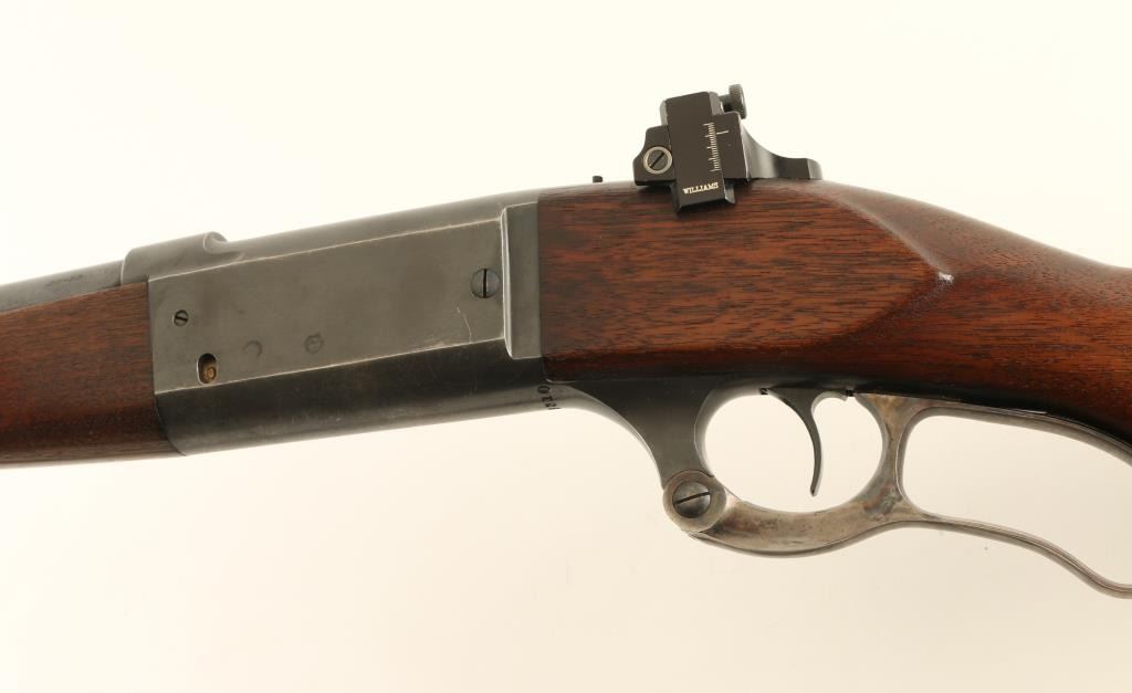 Lever action rifle manufactured circa 1936. Features blued finish, case color finger lever, two piece wood stock with curved grip, flat steel buttplate, 22" barrel, blade front sight, empty dovetail in barrel (rear sight removed), Williams rear peep sight mounted to tang, fixed rotary magazine with brass cartridge counter, lever lock safety, cocking indicator, sling swivels. Bore is very good condition. Retains 75% blue, scratches on barrel, thinning blue on receiver sides, bare metal on sharp edges. Bare metal bolt turning dull. Finger lever retains much case color, fading on sides. Wood is very good with dents & scratches. Includes good condition leather sling. Condition is NRA Very Good *** C&R Firearm ***