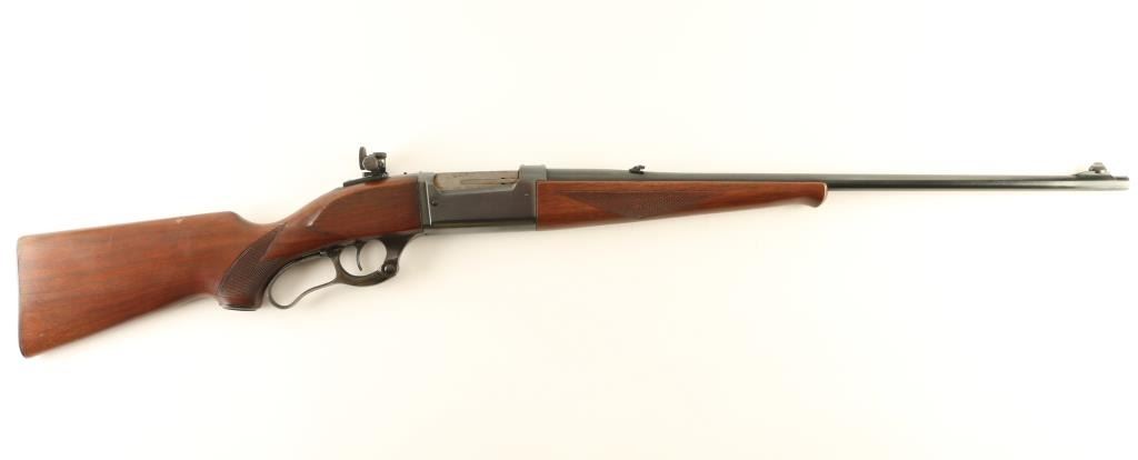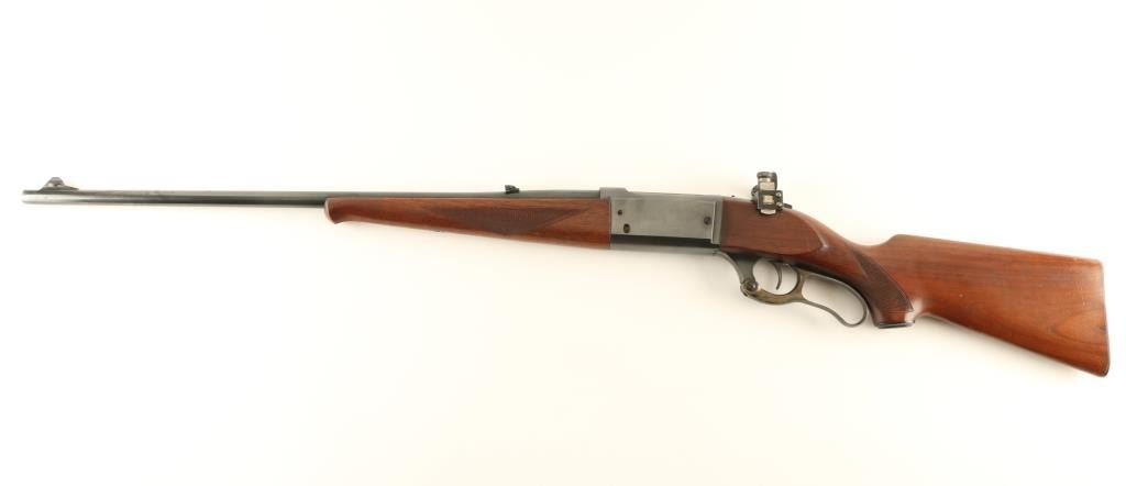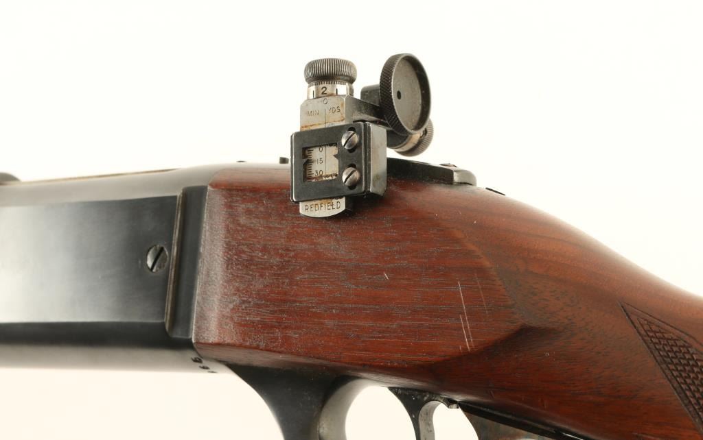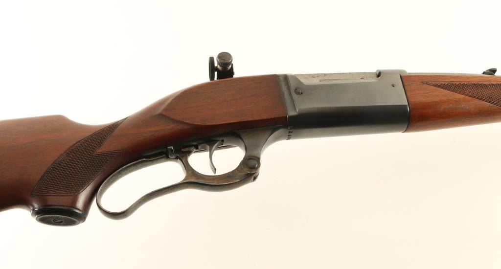 Lever action rifle features blued finish, case color finger lever, two piece wood stock with curved grip, checkering at wrist & forend, flat steel buttplate, 24" barrel, blade front sight, folding rear sight on barrel, Redfield rear peep sight mounted to tang, fixed rotary magazine with cartridge counter, lever lock safety, cocking indicator. Bore is very good condition. Retains 85% blue,with scratches & scuffs, bare metal on sharp edges. Bare metal bolt dulling and showing some discoloration. Receiver top is drilled & tapped, with plug screws filling holes, forward holes partially cover the "SAVAGE" marking. Finger lever retains bright fiery case color. Wood is very good with dents & scratches. Condition is NRA Very Good + *** Modern Firearm ***