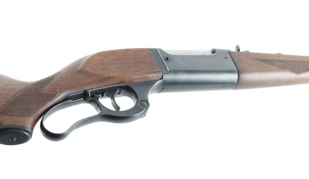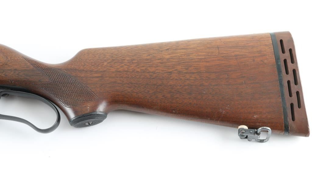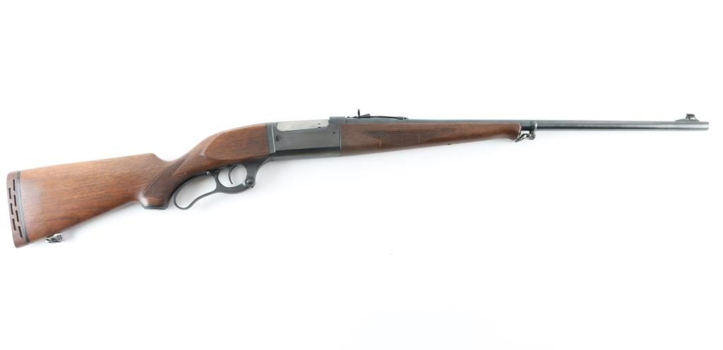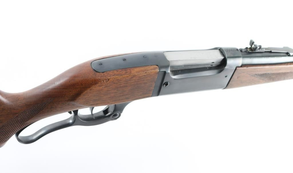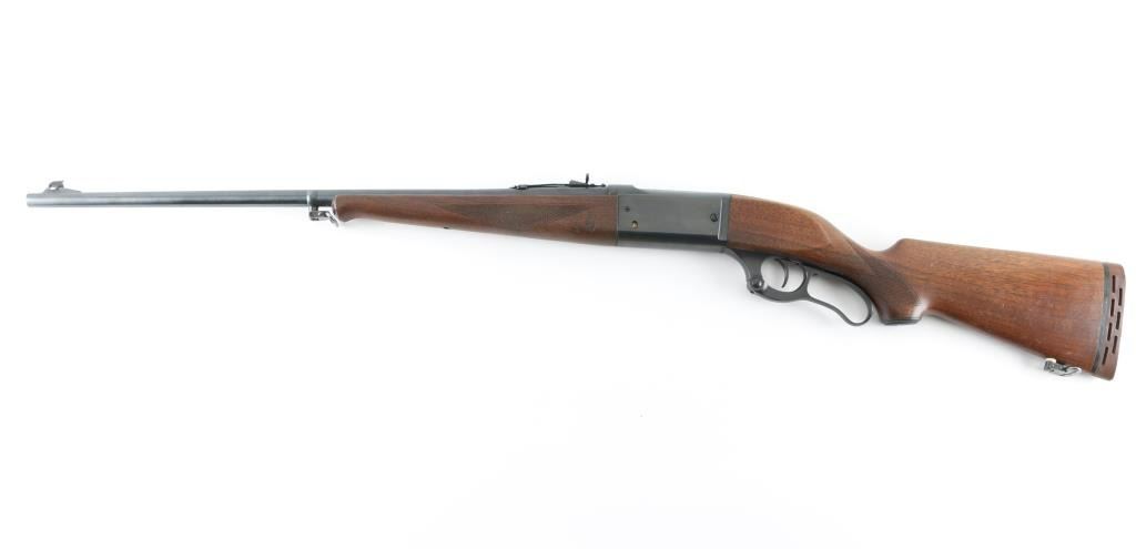 Lever action rifle manufactured circa 1950. Features re-blued finish (including receiver, lever), two piece wood stock with schnabel forend tip & curved grip wrist, checkered panels at wrist & forend, black plastic grip cap, ventilated rubber recoil pad, 24" barrel, blade front sight, sporting rear sight, fixed rotary magazine with brass cartridge counter, safety/lever lock behind trigger, cocking indicator. Sling studs with detachable swivels mounted at stock and on barrel clamp. Receiver ring previously drilled & tapped 2 places, holes filled - rear hole appears welded shut & dressed smooth before re-blue; forward hole shows as a small cylindrical depression. Elevator slider and rear sight appear mismatched, no room to fully slide the elevator. Bore is very good condition. Retains 95% re-blue, with minor blemishes to current finish, some deep scratches to the otherwise smooth surface finish remain from before refinishing. Rear screw thru action has slightly protruding head. Wood is very good with dents & scratches, small gouge out of forend. Recoil pad has turned hard. Markings mostly crisp and readable, "SAVAGE" on receiver ring is partially obscured. Condition is NRA Very Good+ (as refinished) *** C&R Firearm ***