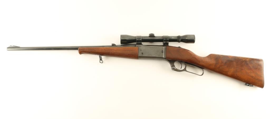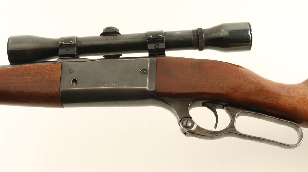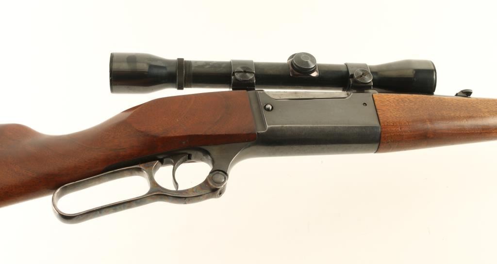 Lever action rifle features blued finish, case color finger lever, two piece wood stock with straight grip, flat steel buttplate, 22" barrel, front sight ramp with empty dovetail (missing front sight), folding adjustable rear sight, two piece Weaver type bases with rings, fixed rotary magazine with cartridge counter, tang safety (also locks lever), cocking indicator, sling studs. Bore is very good condition. Retains 75% blue, scratches on barrel & receiver, bare metal on sharp edges, thinning on receiver bottom. Bare metal bolt is turning dull, with beginning of patina on edges. Finger lever retains bright case color. Wood is very good with dents & scratches. Mounts a Weaver K4F scope, fair to good condition, duplex reticle with clear view. Includes set of quick detach swivels. Condition is NRA Very Good *** Modern Firearm ***