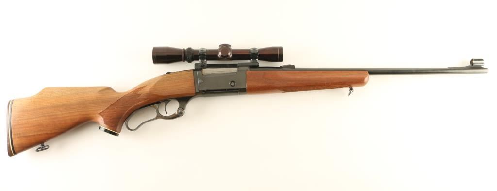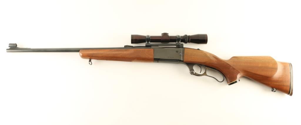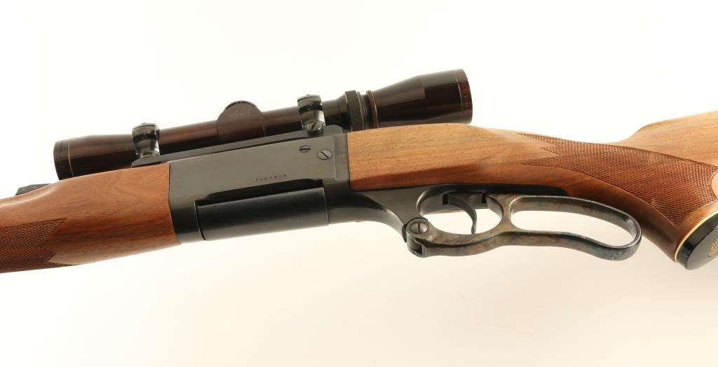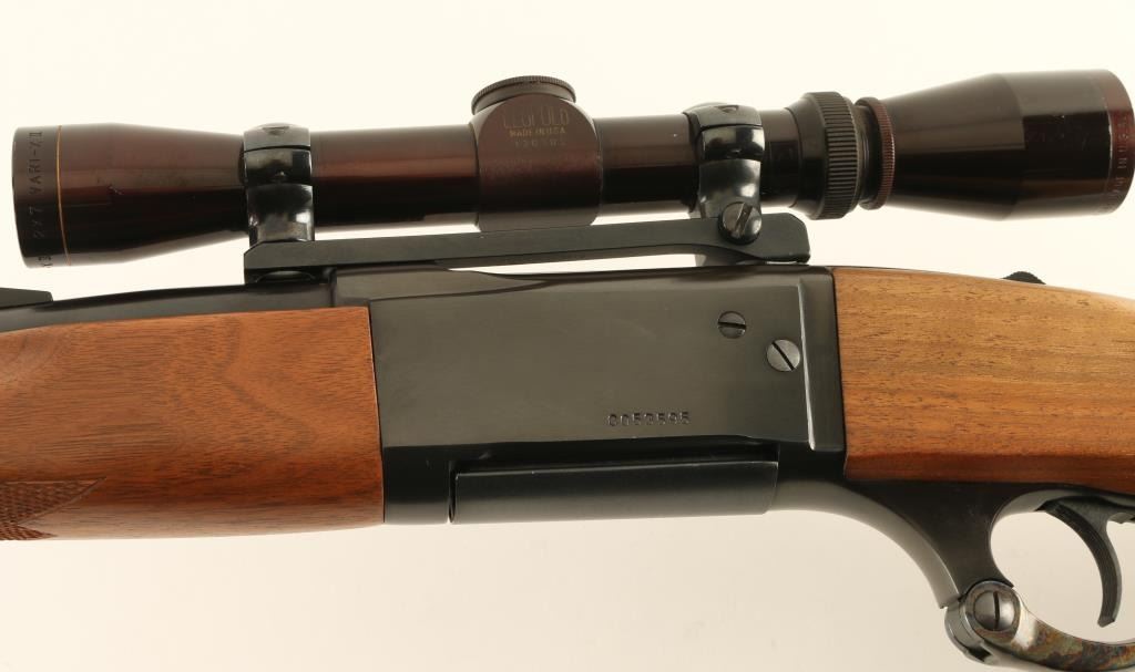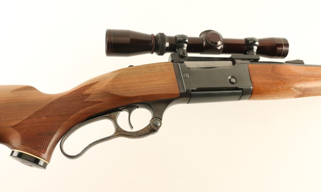 Lever action rifle features blued finish, case color finger lever, two piece wood stock with curved grip, checkered panels at wrist & forend, flat plastic buttplate, 22" barrel, hooded blade front sight, Williams rear sight base (no rear sight), one piece Redfield scope base with rings, detachable box magazine, tang safety (also locks lever), cocking indicator, sling swivels. Bore is very good condition. Retains 85% blue, with scratches & scuffs, bare metal on sharp edges. Finger lever retains bright case color. Wood is very good with dents & scratches. Mounts a very good condition Leupold Vari-X-II 2-7x scope with duplex reticle & clear view. Includes (1) magazine. Condition is NRA Very Good + *** Modern Firearm ***