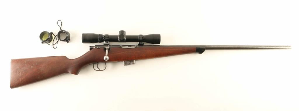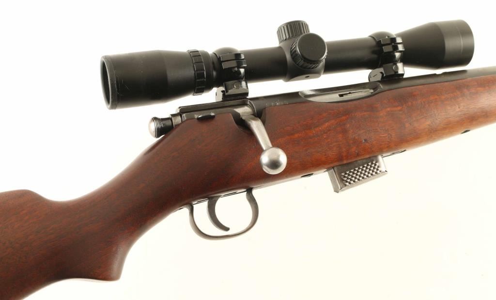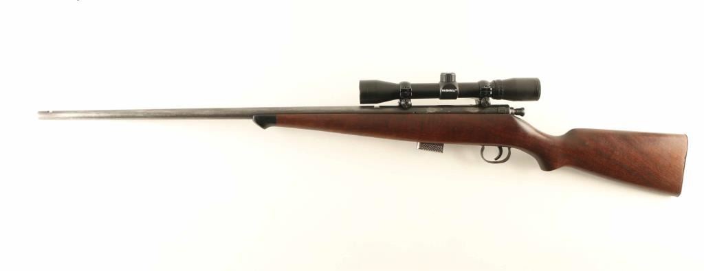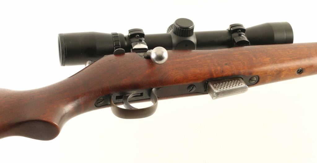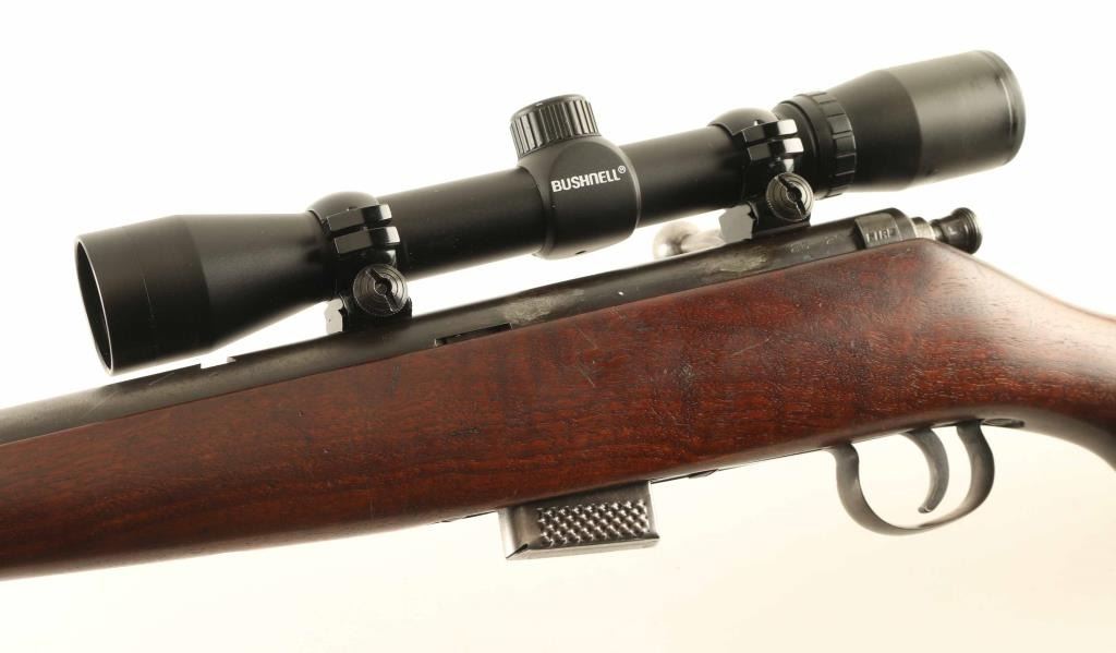 Rifle. Bolt-action. 25" barrel. Sights removed. Mounted with a Bushnell scope, clear optics. Right mounted thumb safety. Magazine releases by pushing it forward. Blued barrel is about 70%, with some scratches, and finish loss. Chrome bolt. Wood is very good with some scratches/rubs. Steel, Savage marked buttplate, Top of foregrip has been painted black. Bore appears excellent/bright. Action is smooth tight. NRA Condition-Very Good. C&R Firearm.