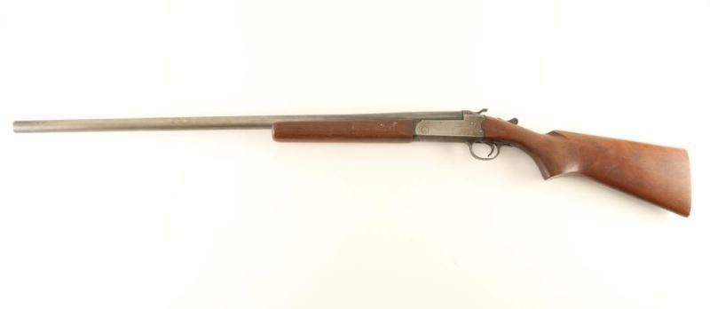 American made break-action single shot shotgun chambered for 2 3/4" 12 gauge shells. Features a blued 30" barrel, no front sight(broken off), channel cut rear sight, ejector, smooth trigger, serrated hammer spur, knurled top lever, case hardened receiver, smooth wood forend and pistol grip shoulder stock without a buttplate. The shotgun was stripped of most of it's original finish and has been left in-the-white and now shows a light coat of emerging rust on the barrel forward of the forend. Action performs well, bore is slightly dull but appears good and the wood stocks are good showing a few minor cracks in the wrist extending from the receiver. Condition is NRA poor to fair. ***C&R Firearm***