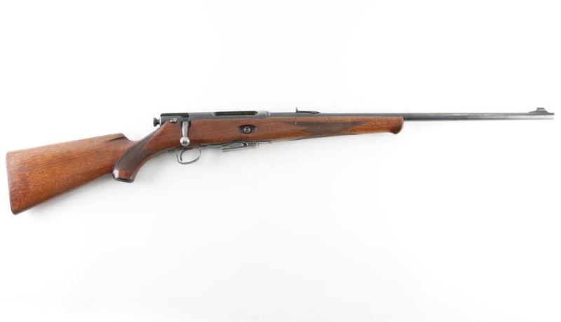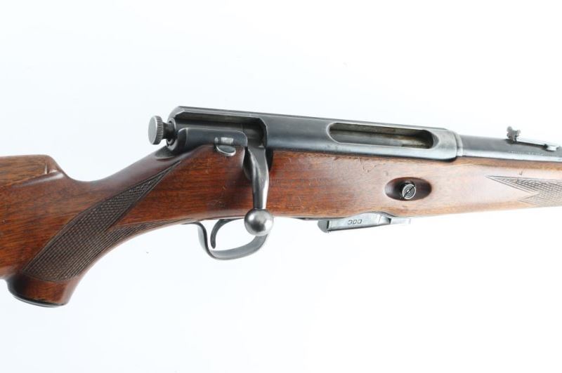 Vintage bolt action rifle manufactured circa 1929-1940. Features blued finish, wood stock, 24" barrel, ramped dovetailed blade front sight, folding rear sight, rotating collar safety, grooved steel buttplate, push button magazine release in right side of stock. Stock has shallow cross hatched checkering, schnabel tip, composition grip cap. Retains 60% blue with losses from handling and use, some thinning and graying. Wood is very good condition. Includes (1) magazine. Condition is NRA Very Good *** C&R Firearm ***