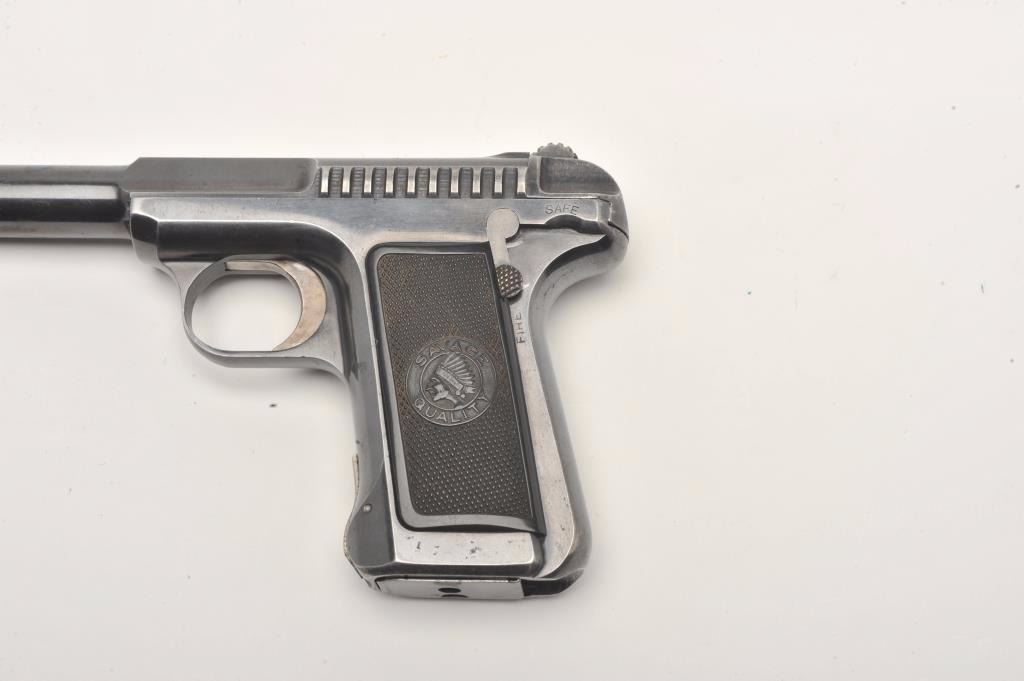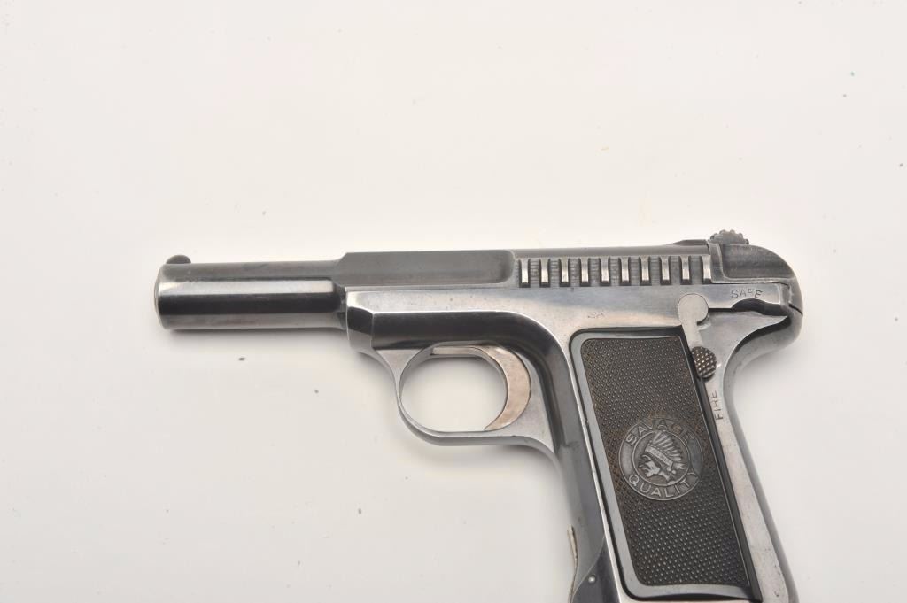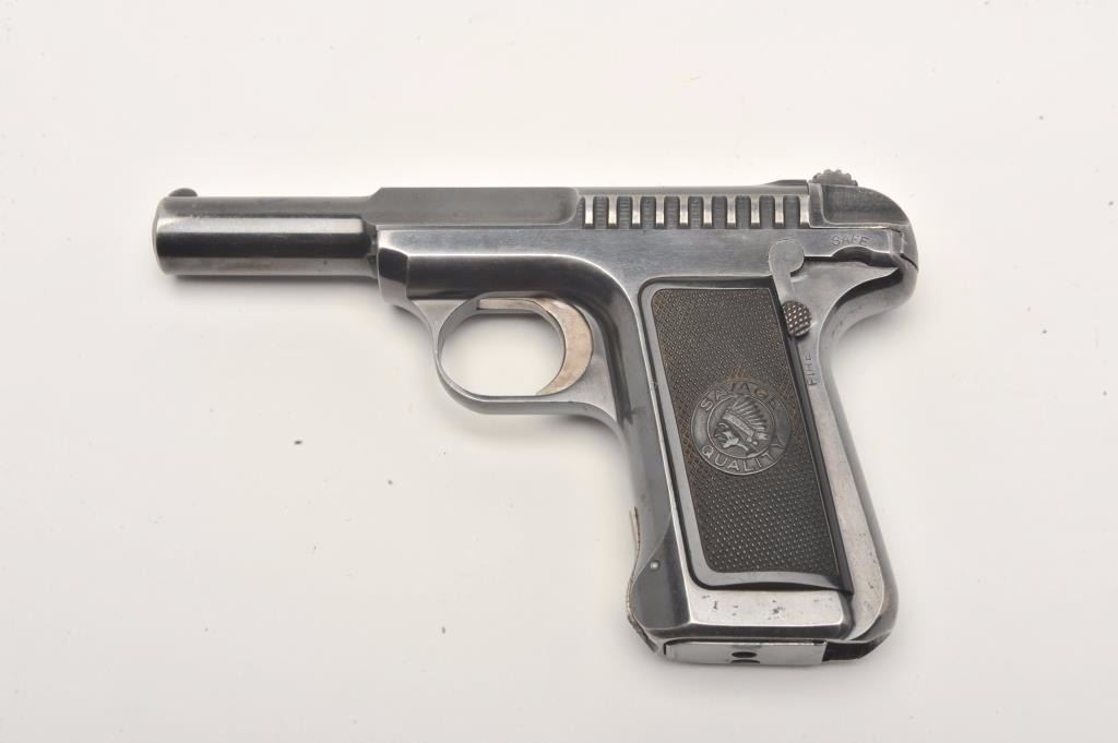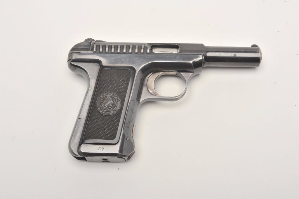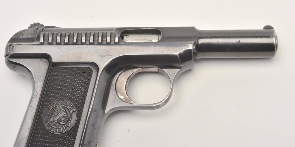 Savage semi-automatic pistol, 7.65mm caliber, 3.75” barrel, blued finish, checkered black hard rubber grips, S/N 175296, in overall very good to fine condition displaying the majority of its original finish with somemuzzle and high point wear, very good bore, crisp action and markings, fine grips. (C&R/No PPT). Est.: $300-$600.