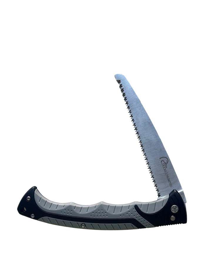 Folding field saw with a TPR grip for added safety. Gray and black handle with horizontal logo printed on the blade. Blade measures 6.75". Opened measurements are 15.25".