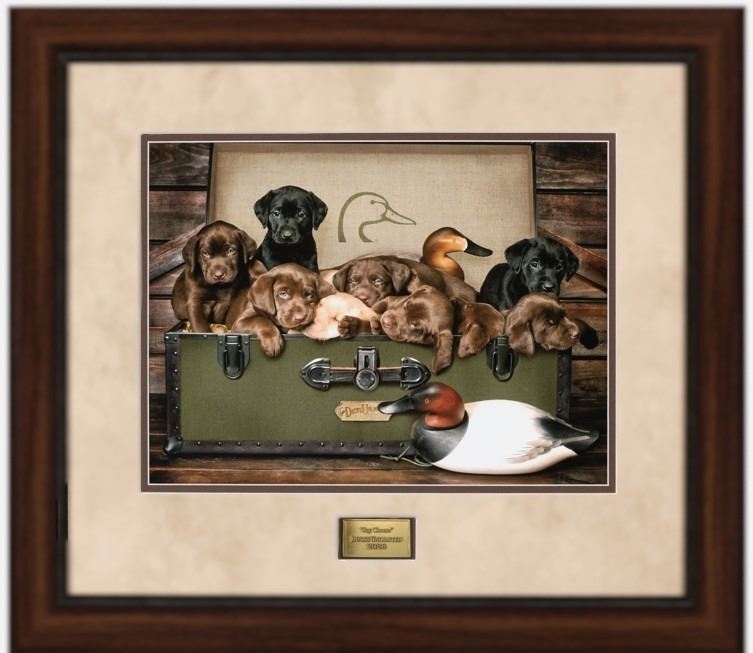 Dave Hagan’s charming photograph captures a heartwarming scene of yellow, chocolate, and black Labrador puppies nestled together inside a Ducks Unlimited chest, embodying the promise of future hunting companions. Evoking rich traditions of the sport, two carved canvasback decoys—one prominently displayed in front and another tucked gently among the pups—add depth and heritage to the image. This signed and numbered 11” x 14” photograph is beautifully matted and framed to 21.75” x 19.25”, complete with a brass title plate inlaid in the mat, making it a cherished addition to any art collection.