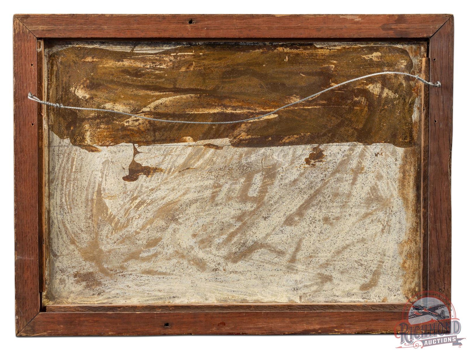 Early SST (single sided tin) sign with good color and features a great scene with three workers on the creek bank with blasting taking place in the background. These are extremely hard to find in any condition. This example displays with great patina and exhibits significant wear as shown, including flaking, scratches, oxidation and light bends. Mounted in a wood frame with wear. 16.5" H x 22.5" W.