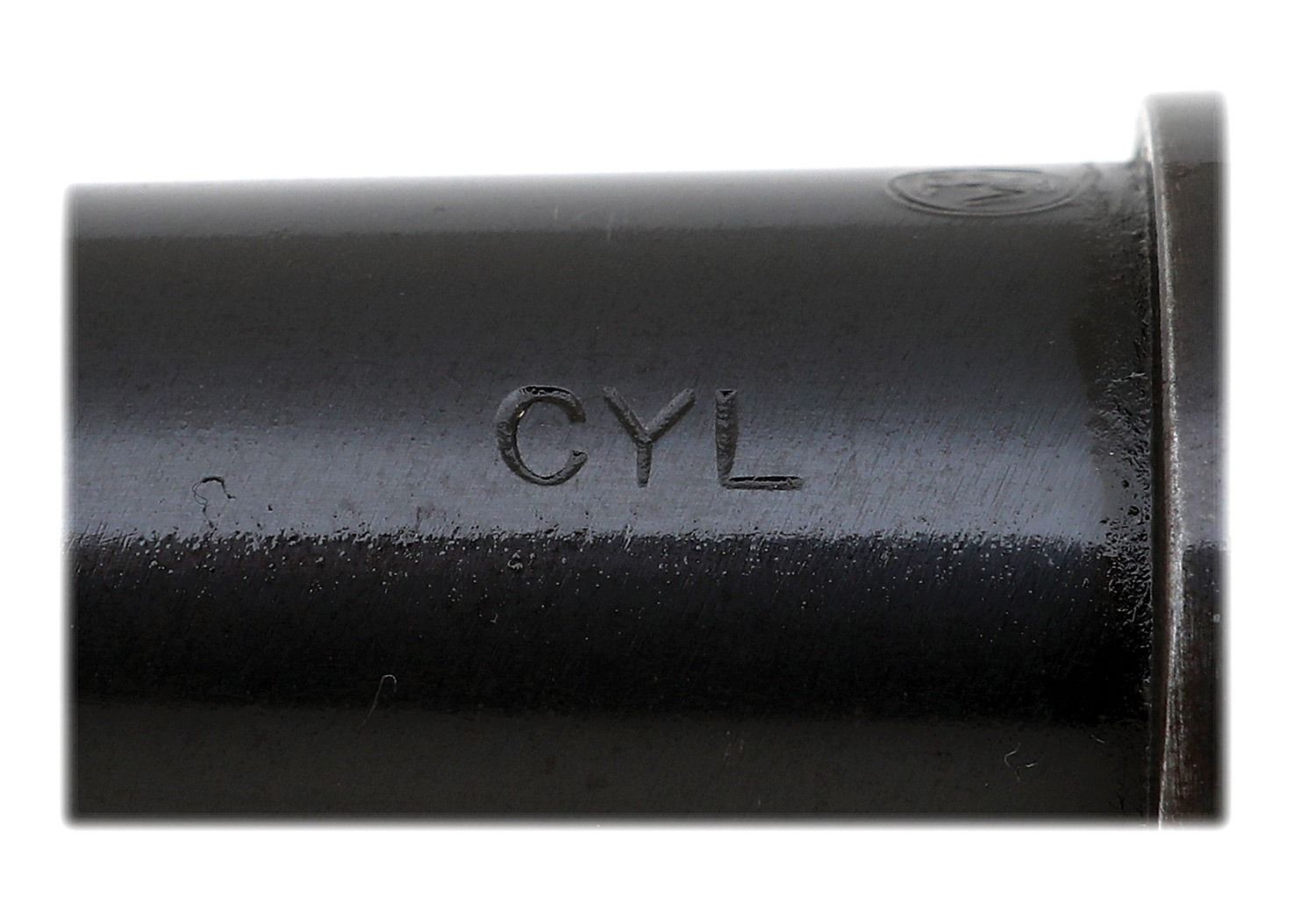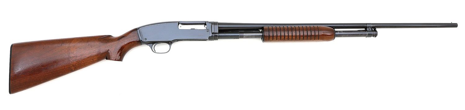 serial #89616, 410 bore (3''), 26'' plain barrel choked cylinder with a bright excellent bore. The metal surfaces of this 1950-vintage shotgun retain about 90% original blue with light wear on the high edges and contact points, light thinning to gray along the barrel, and a spot of old oxidation on the receiver extension. The bolt and shell carrier are bright with some pinprick pitting and gray freckling, the bolt showing a scratch about midway. The smooth pistolgrip walnut stock and 14-groove flat bottom forend are in very good condition with light dings and handling marks scattered about, and a few small spots of flaking finish; the checkered Winchester Repeating Arms hard rubber buttplate is intact, giving an about 14'' length of pull. The factory markings are largely intact and crisp, ''MODEL'' in the barrel address marred by an old light ding, and the receiver extension is numbered to the gun; the barrel appears undated. The shotgun is sighted with a lone brass bead. A rare Model 42 with a cylinder choke, Winchester no longer cataloguing that option after 1952. (14B11523-16) {C&R} [Jim Thrash Collection] (1500/2000)