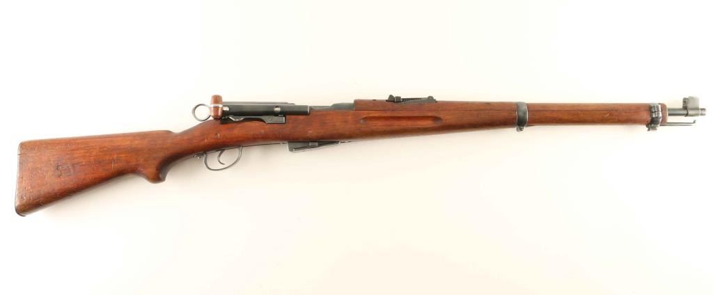'K-11' Vintage Swiss military straight-pull bolt action service rifle chambered in 7.5×55mm Swiss, manufactured at Eidgenoessische Waffenfabrik, Bern circa 1931. No import marks. Features a blued finish, 23.3" barrel with recessed crown, shrouded blade front sight adjustable for windage, tangent rear sight graduated to 1,500 meters, stacking hook, two barrel bands with bayonet lug on the front band & sling swivel on the rear band, red hard rubber charging handle, detachable 6 round magazine, stripper clip guide cuts in the receiver, ring cocking piece/safety on the rear of the bolt, smooth curved trigger, smooth wood handguard and pistol grip shoulder stock with finger grooves in the forend, sling bar on the left side & flat metal buttplate. Serial numbers match on the receiver, bolt, and magazine. Rifle is stamped "P" which indicates it was purchased by the soldier upon his retirement. Includes a 1968 dated receipt to Lt. Col. Robert Stratton US.M.C. Ret. for the amount of $24.50. Rifle exhibits approximately 90% of it's fine rust blued finish showing light scattered wear. Action is sound, the bore is pristine and the wood stocks are very good. Condition is NRA Fine. ***C&R Firearm***