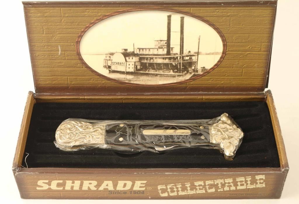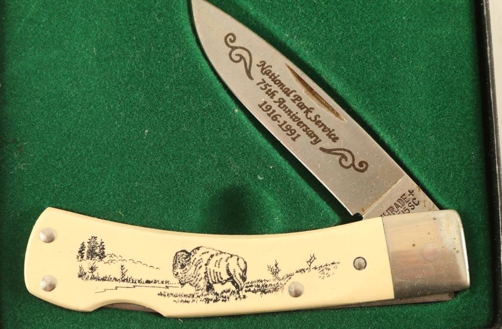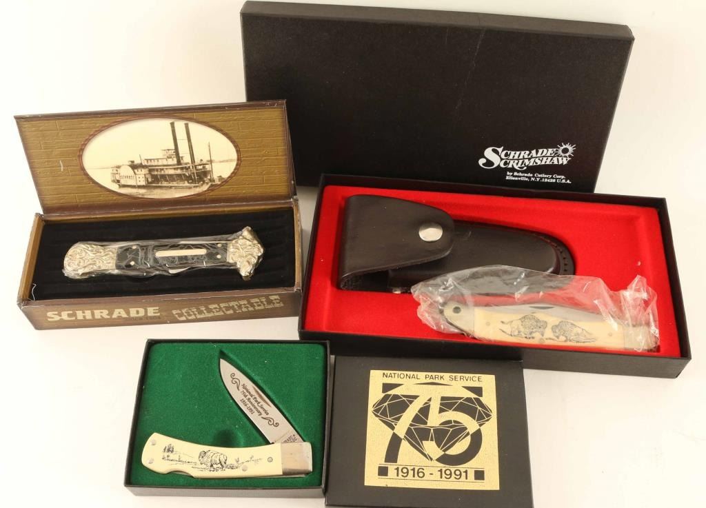 Total of Three Schrade Knives. One 75th Anniversary of the National Park Service and One Schrade Scrimshaw SC 500. All are in original boxes. See Photos