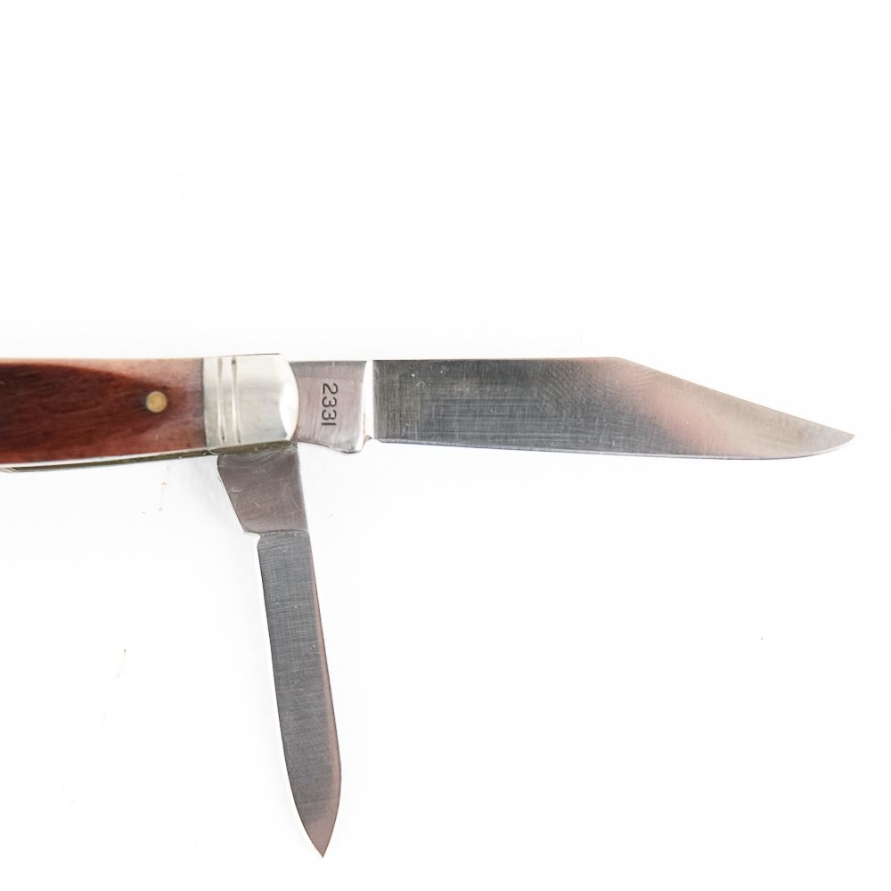1985 Production Schrade USA Heritage Series Pocket knife. Model 2331 knife is in excellent like new condition with only minor storage wear on bolsters. Very nice high grade vintage collector knife. 3.25" closed length. See photos.