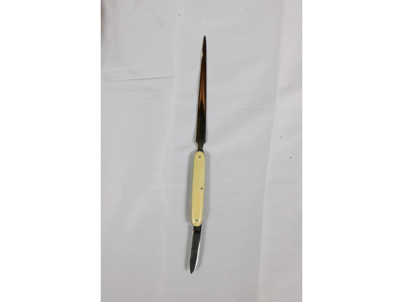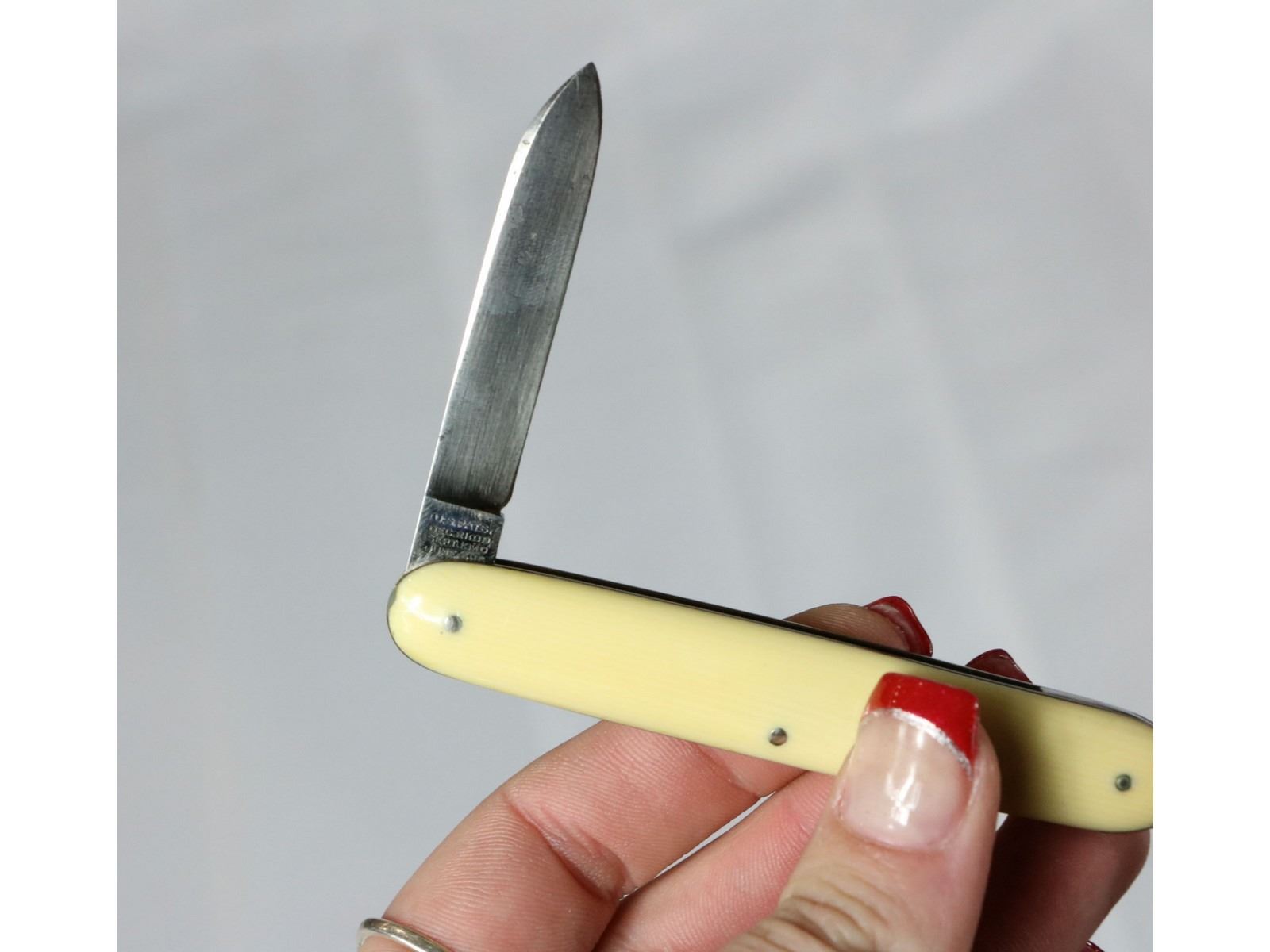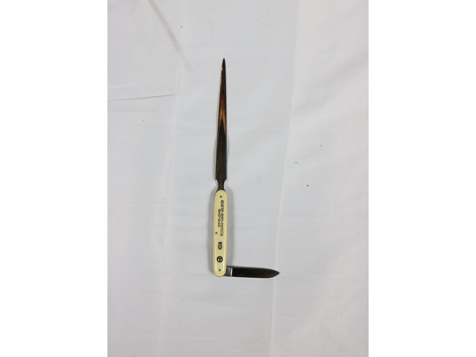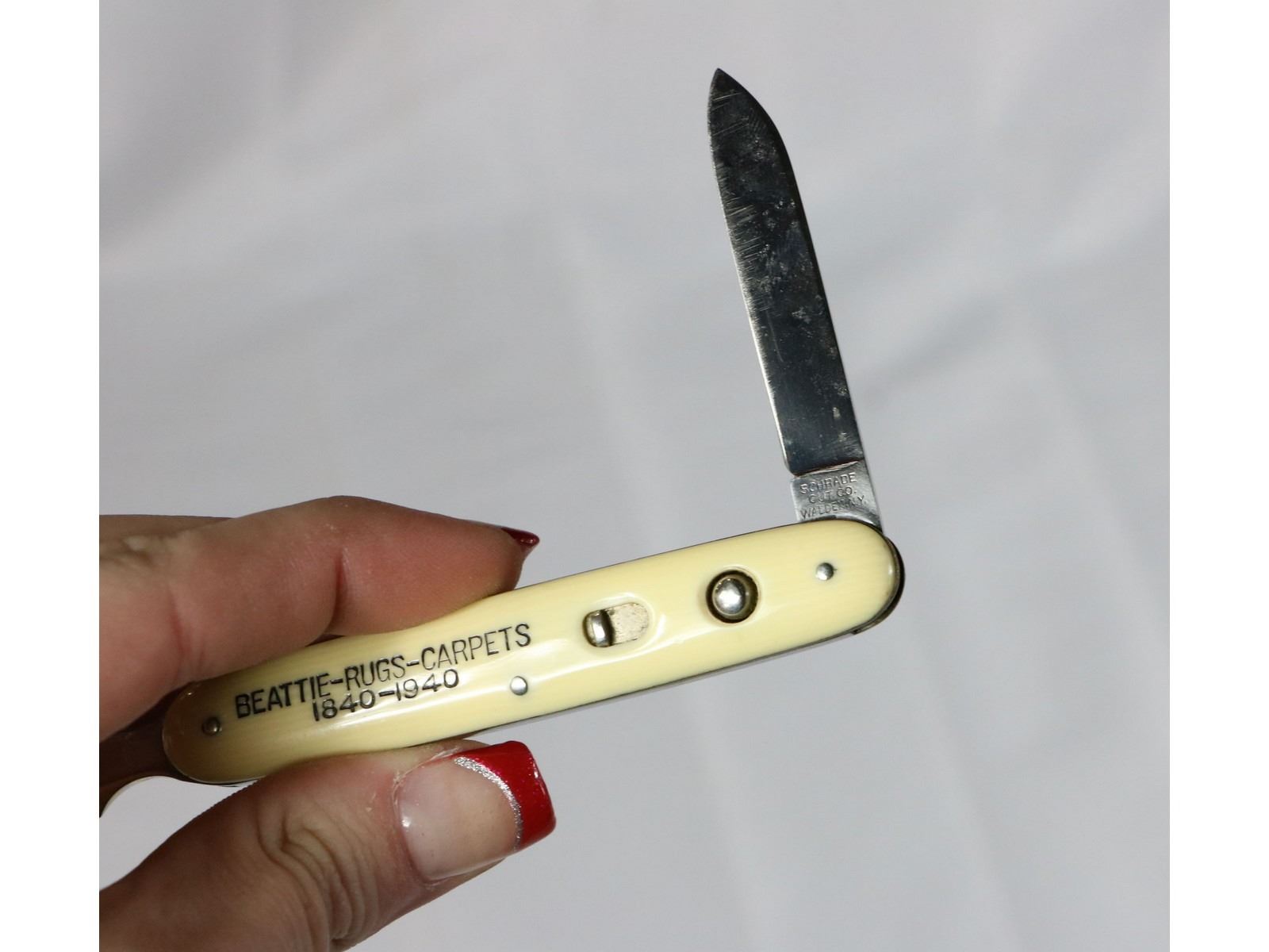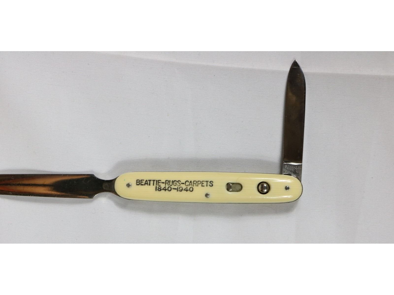 Type: Side opening. Country: United States. Manufacturer: Schrade Knife Co.. Release: Push button. Length: 10 7/8". Scales: Plastic. Bolsters: None. Liner: Brass. Condition: Excellent. Tang markings: "Beattie-Rugs-Carpets 1840-1940". Note: Letter opener blade is fixed.