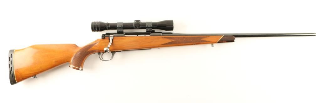 Finely crafted bolt action sporting rifle chambered in 7mm Remington Magnum, produced in Otterup Denmark. Features a blued finish, 23 3/4" barrel, no sights, Redfield 4x fixed power scope, polished bolt, internal box magazine with hinged floorplate, serrated trigger, safety switch on bolt, sling swivel, and checkered wood pistol grip shoulder stock with inlayed caps, cheek rest & factory recoil pad. Rifle shows muzzle wear as well as some other small losses on the barrel and light edge wear on the floorplate & trigger guard with approximately 87% finish intact overall. Action is smooth, bore is pristine and wood stock is very good++ with some dents & dings. Condition is very good++. ***Modern Firearm***