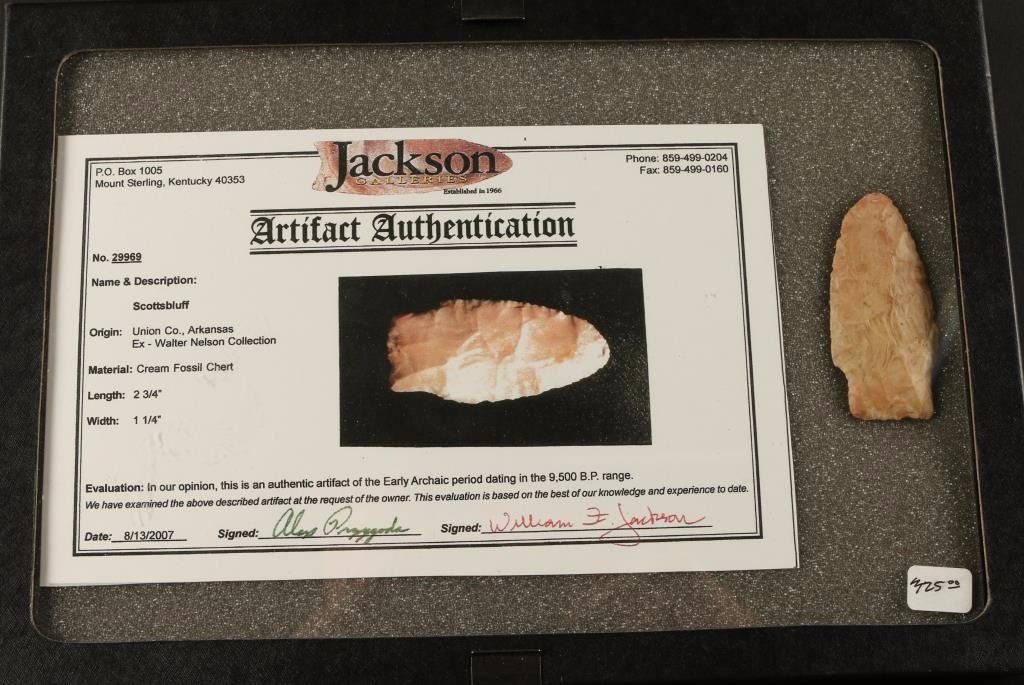 Origin Union Co Arkansas Ex- Walter Nelson Collection, Cream Fossil Chert 2 3/4"LX 1 1/4"W includes a artifact authentication from Jackson Galleries.