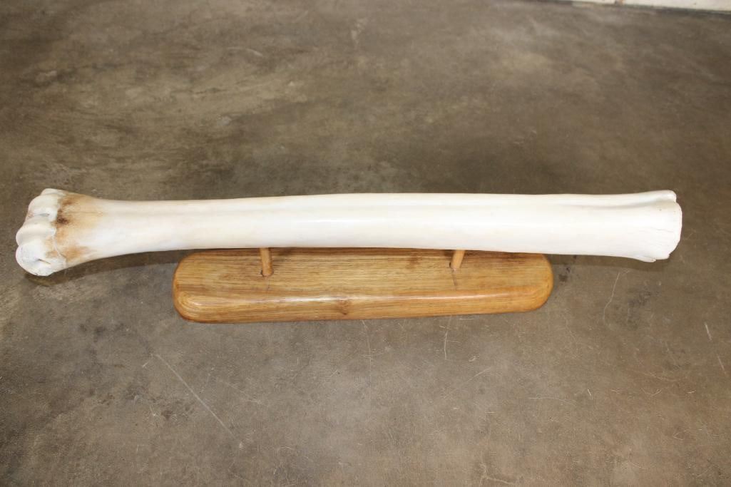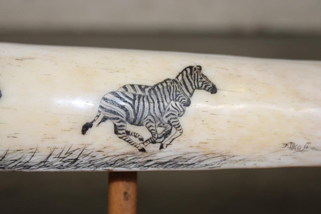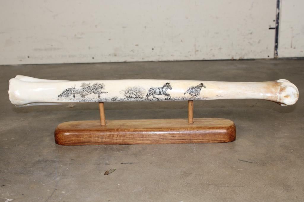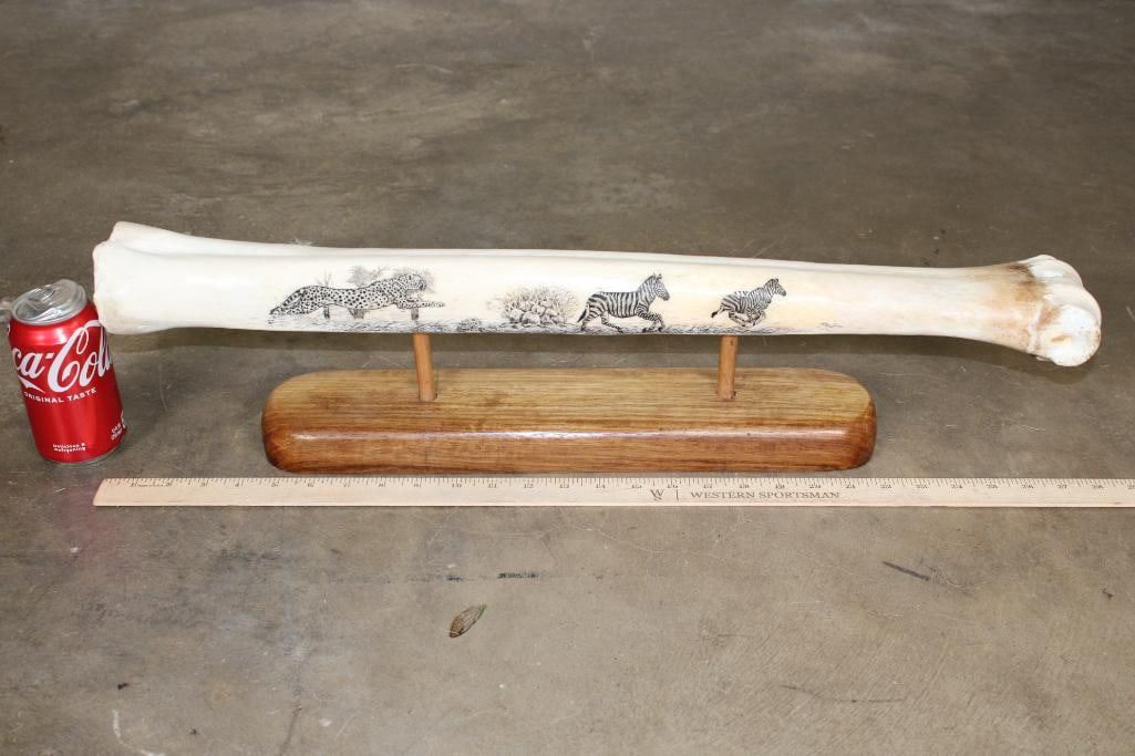 Scrimshawed GIRAFFE Leg Bone on a Wooden Display Stand by African Artist J.Nkosi. The etched scene is a Cheetah chasing Zebras. It measures 28" Long x 4" Wide x 6" Tall and the Total Weight is 7 lbs 20 oz. COLLECTIBLE TAXIDERMY AFRICAN ART