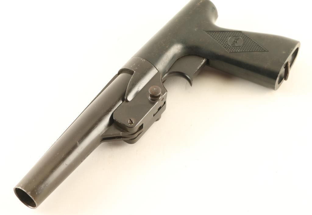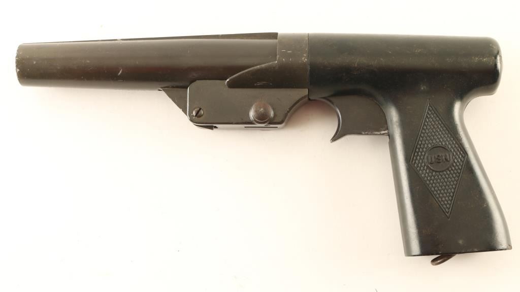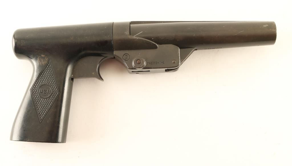 USN marked flare launcher features 6" barrel, double action only trigger, internal hammer, button latch to break open, lanyard ring at butt. Bore is very good condition with some roughness. Metal surfaces retain 85% dark greenish brown colored finish, with scratches and rub spots revealing bright silver colored metal underneath. One piece grip is black plastic, good to very good condition. Markings include "S" inside circle & "242692-A-2" on right side, "SIGNAL PISTOL MARK 5 R.F. SEDGLEY INC. 1942" on barrel. Overall condition is Very Good.