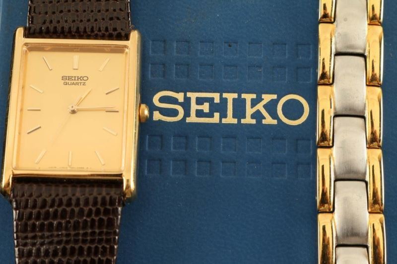 Gold colored, square face watch with leather band. Back is marked 'Seiko base metal stainless steel #676629', in box. Also includes mens magnetic healing bracelet.