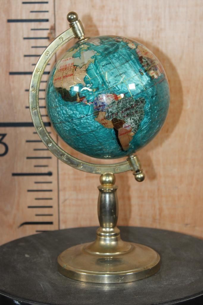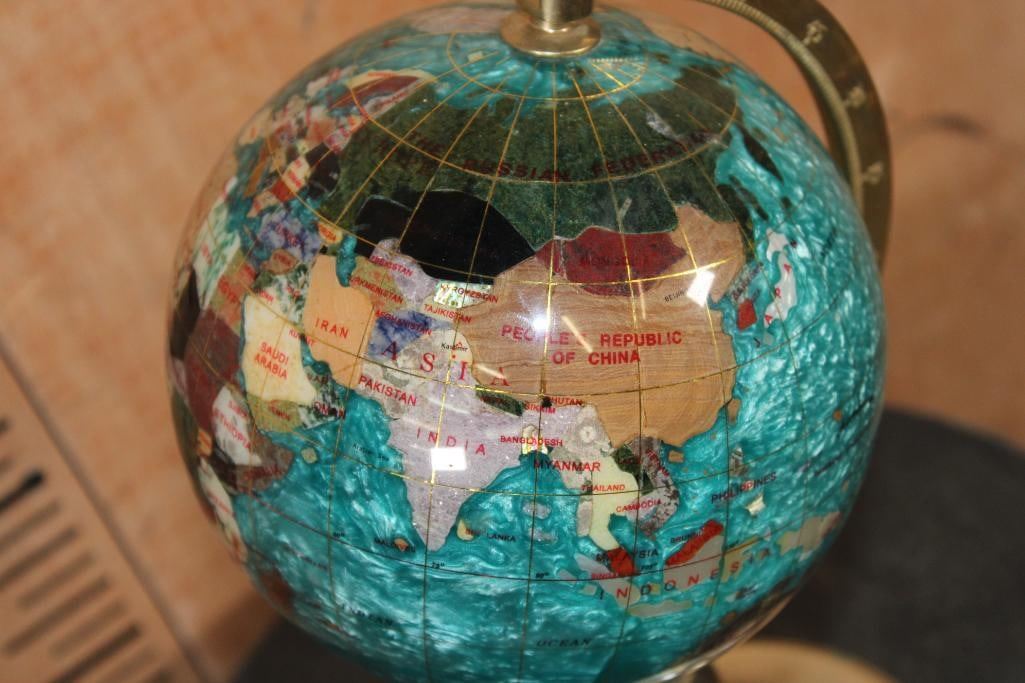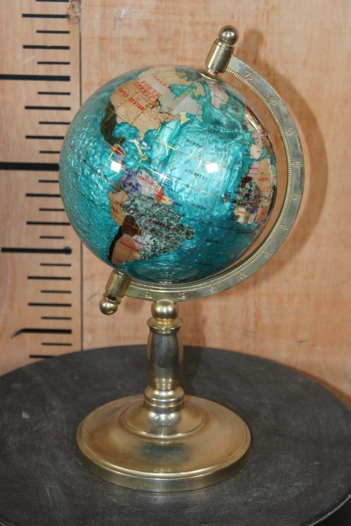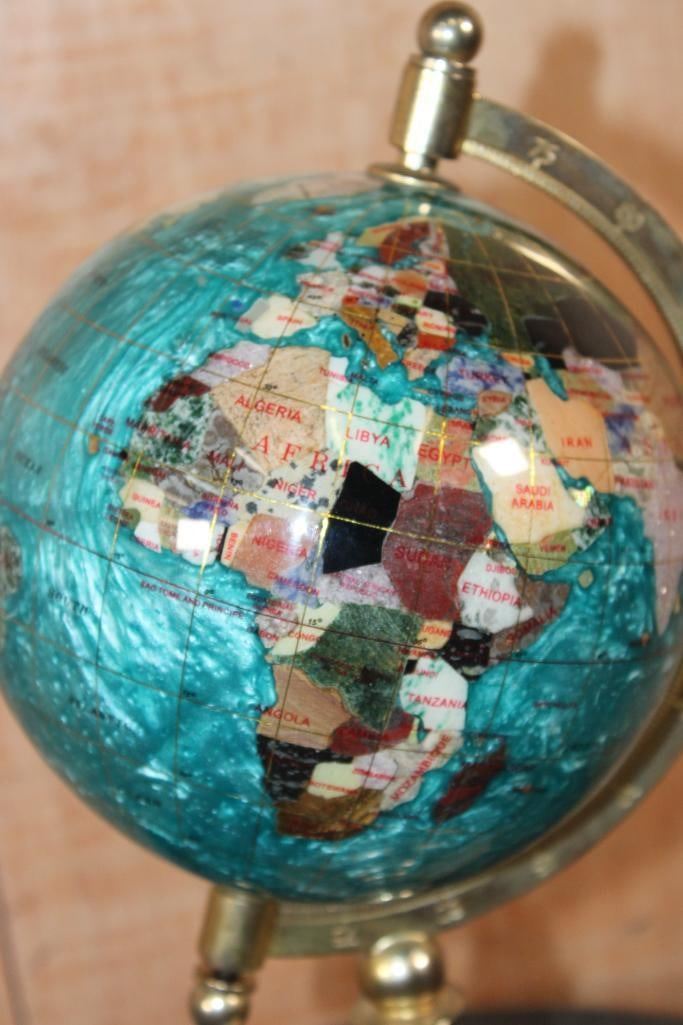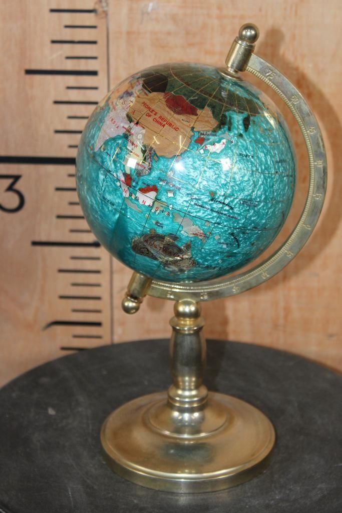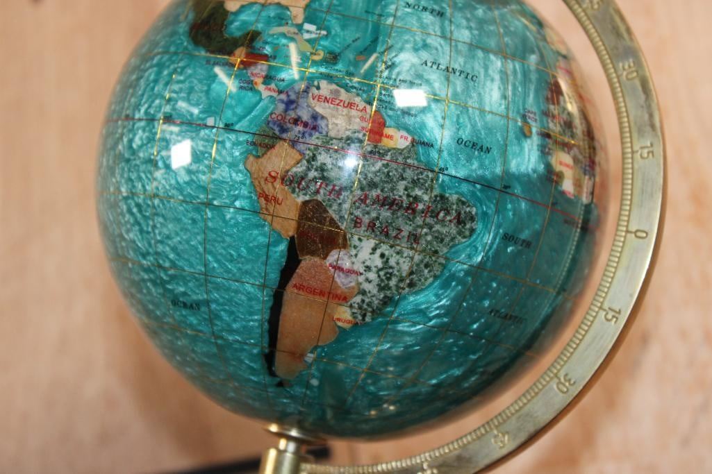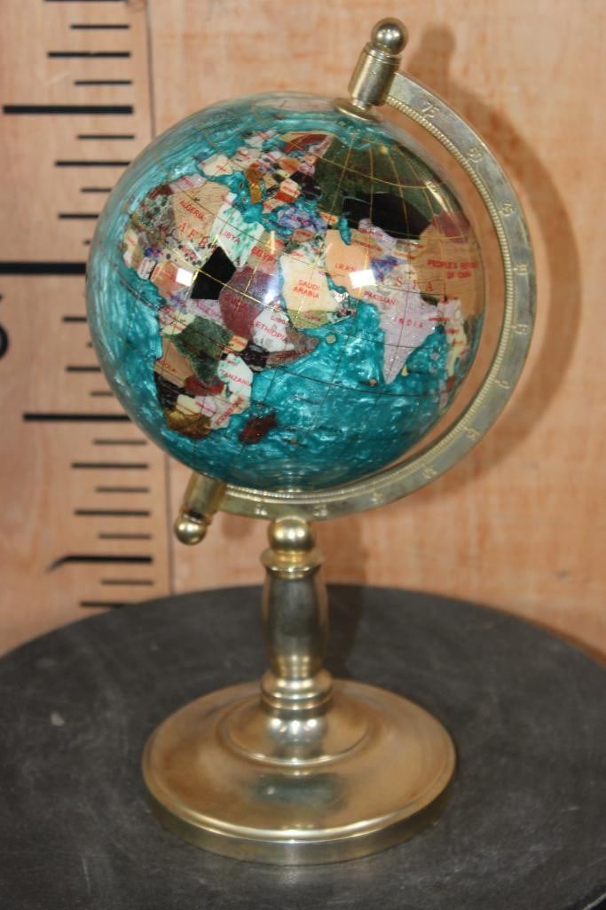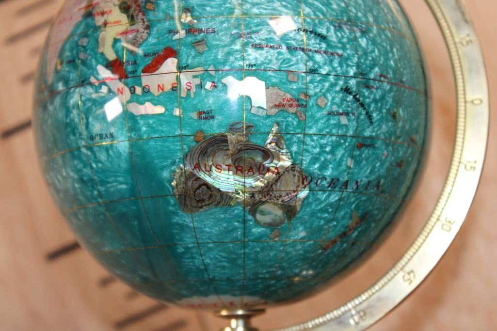 Very Nice World GLOBE with Semi-precious Gemstones and Minerals inlaid. The Stand and Meridian Brass. It measures 12" Tall x 6.5" Wide and Weighs 3 lbs 2 oz. DECORATIVE AND COLLECTIBLE GLOBES