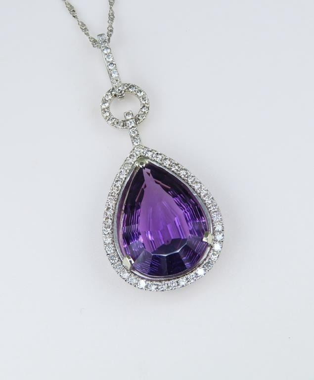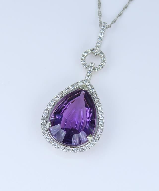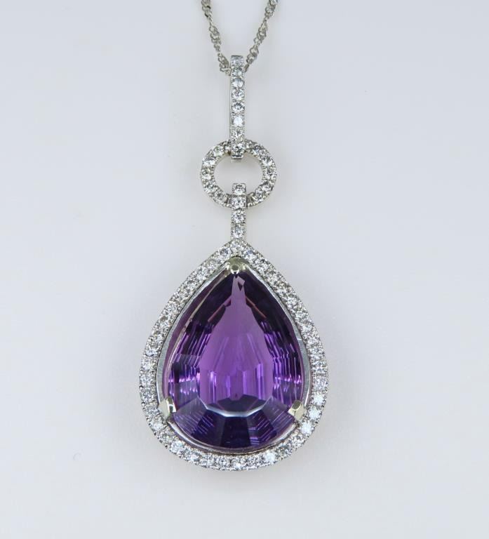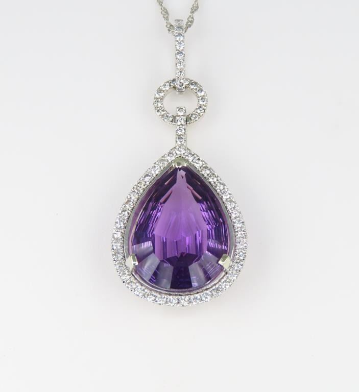 Featuring a vibrant pear shape Amethyst weighing approx. 10.00 carats and accented with over 70 pave set round Diamonds weighing approx. 0.70 carats with H-I colors and SI clarity set in a beautiful designer style setting crafted in 14 karat white gold. Retail $6,000-$9,000.